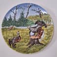 Ceramiczny, ścienny talerz kolekcjonerski z motywem cietrzewia. Przedstawia scenkę myśliwska i ma refeliowy wzór. Motyw jest kolorowany ręcznie. Średnica 31 cm, sygnowany Majolica. Możliwy dow