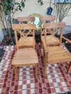 4 krzesła drewniane krzyżykowe, jedno z podłokietnikami . W dobrym stanie, nie zniszczone, nie rozchwiane. Cena za komplet 420 zł. Możliwy transport.