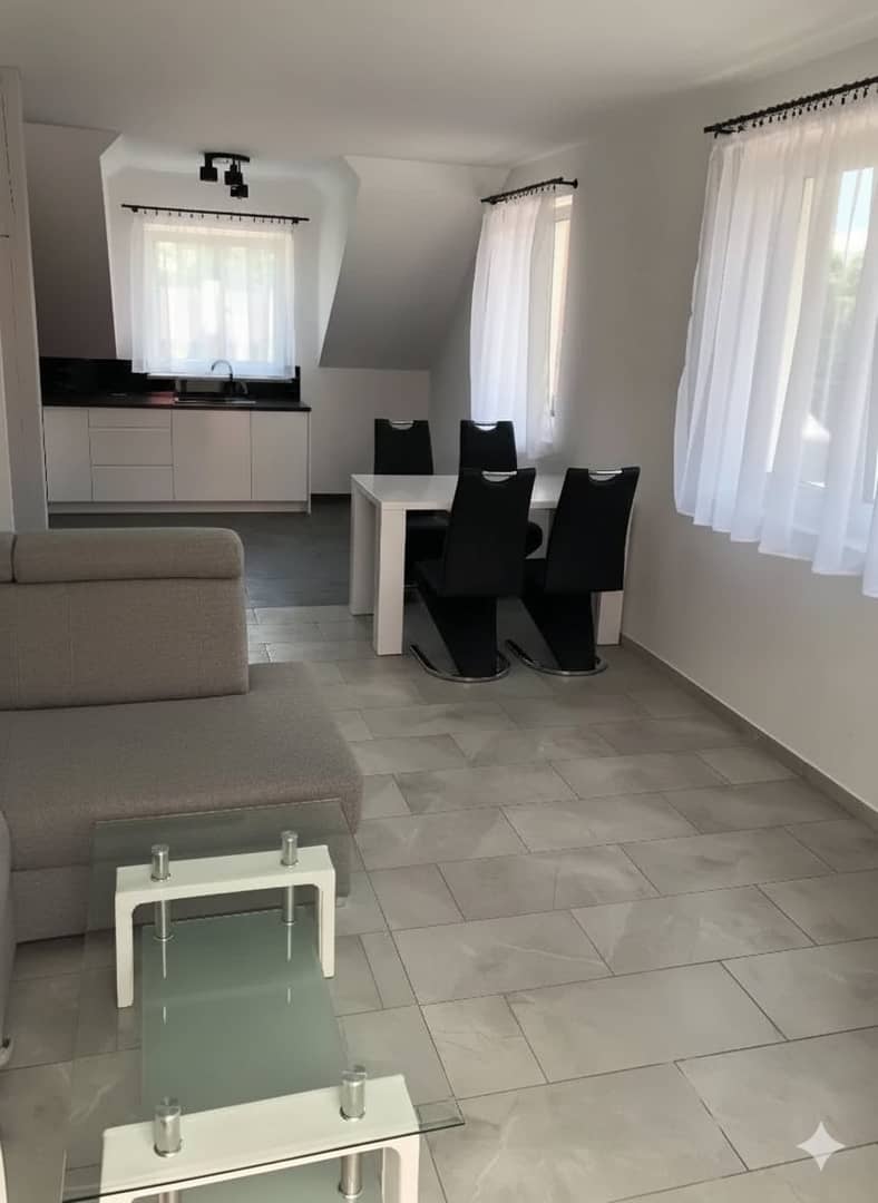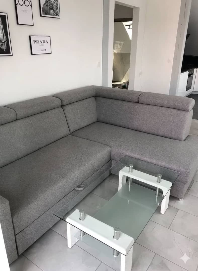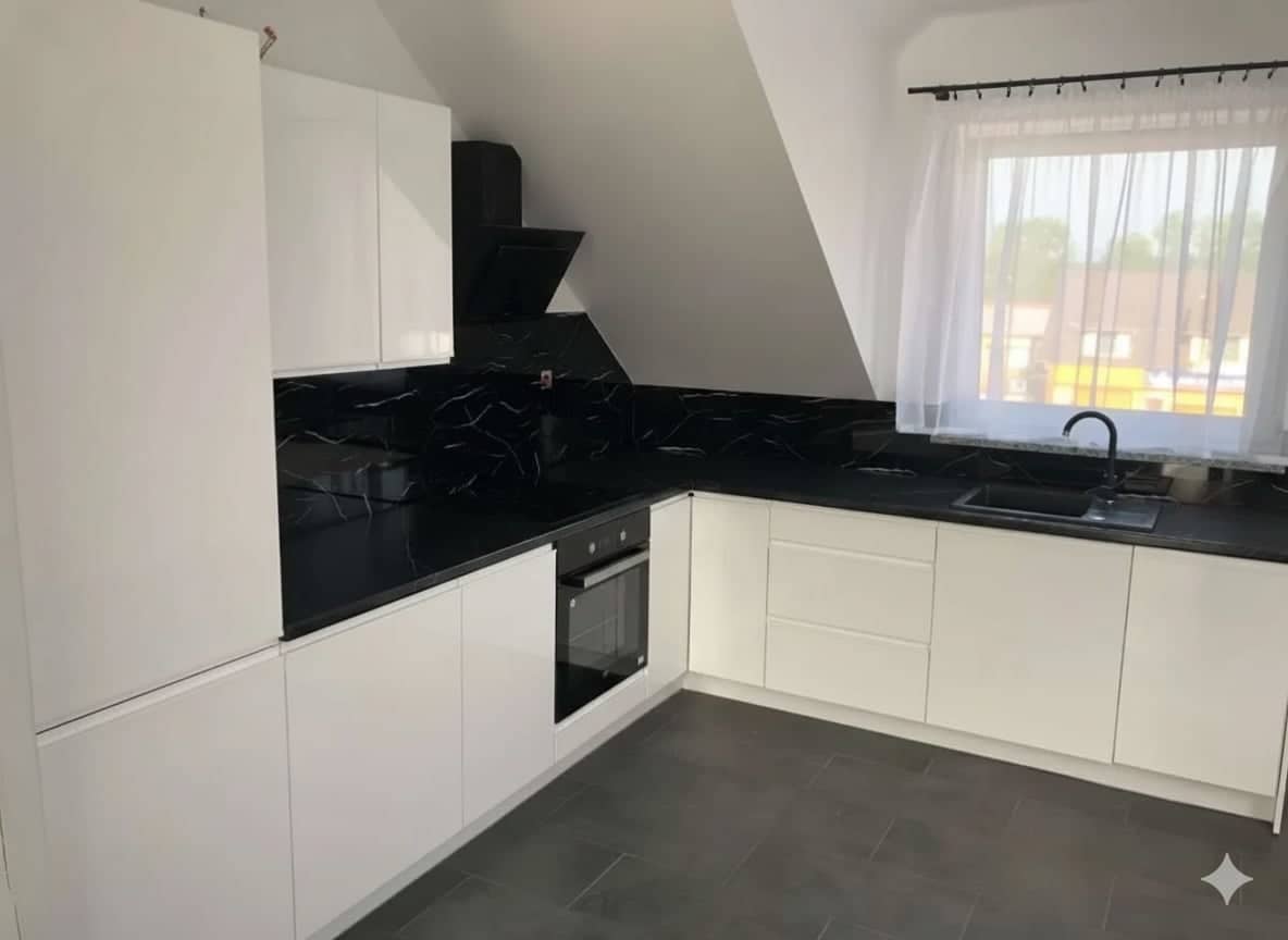• Nowoczesna kuchnia: meble na wymiar, piekarnik, lodówka, zmywarka, płyta indukcyjna, okap, stół z krzesłami, narożnik w salonie