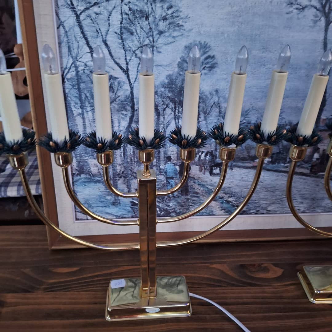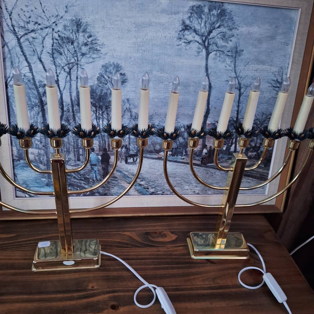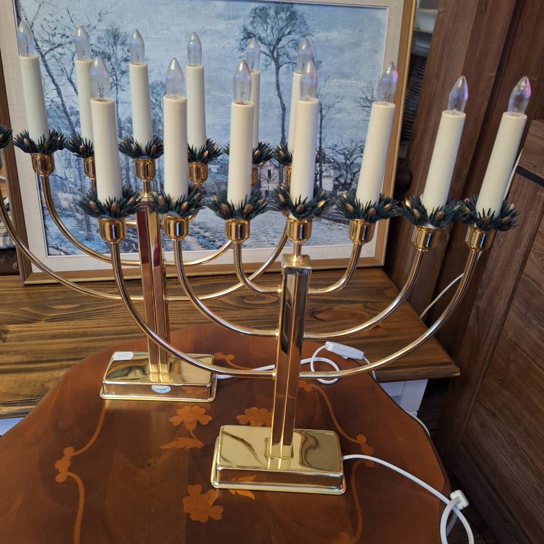 Dwa jednakowe świeczniki adwentowe w bardzo dobrym stanie, w złotym kolorze, z ozdobnymi gałązkami. Wysokość 43, szerokość 33 cm. Możliwy dowóz lub wysyłka. Cena za dwa 180 zł.