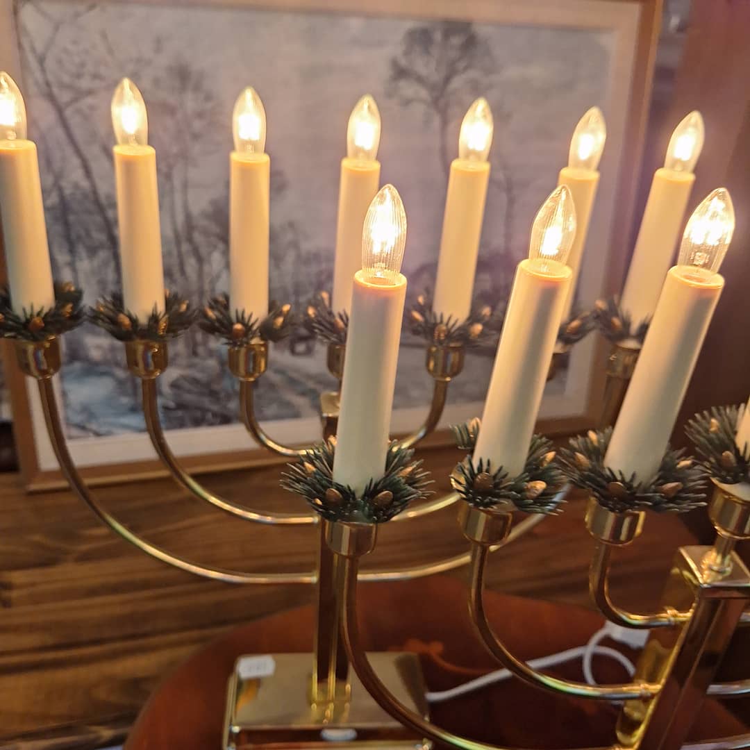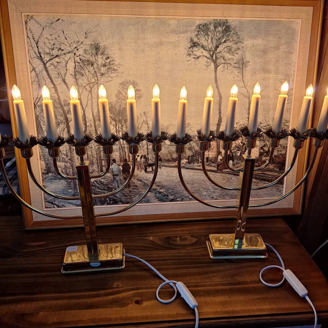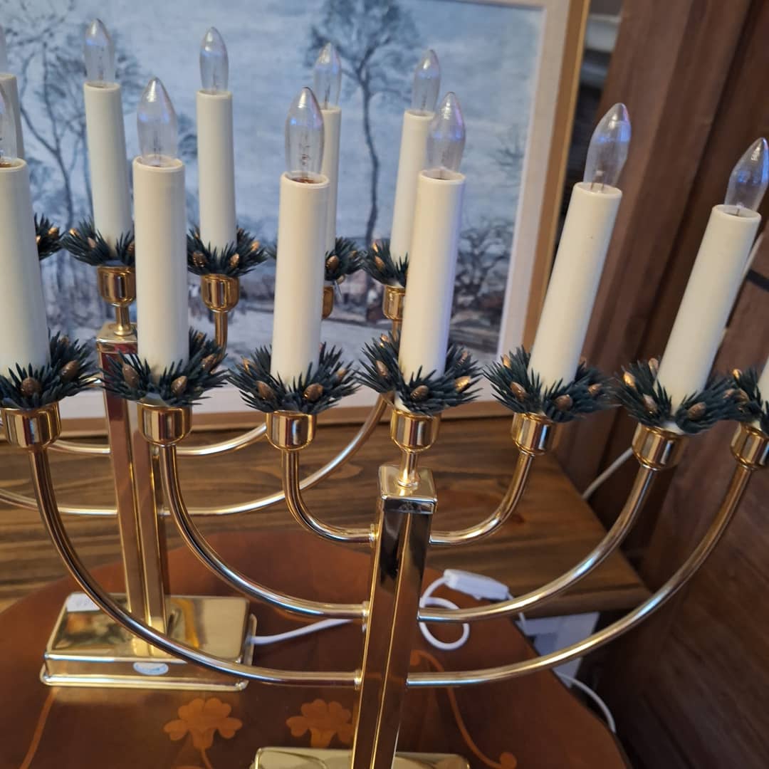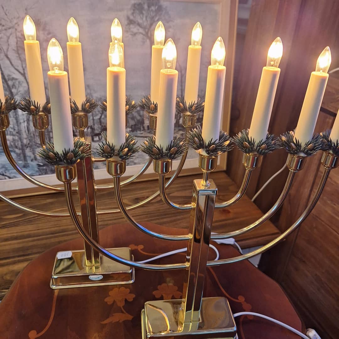 Dwa jednakowe świeczniki adwentowe w bardzo dobrym stanie, w złotym kolorze, z ozdobnymi gałązkami. Wysokość 43, szerokość 33 cm. Możliwy dowóz lub wysyłka. Cena za dwa 180 zł.