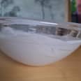 Szklana misa Kosta Boda Atoll Bowl w białym kolorze, zaprojektowana przez Annę Ehrner dla szwedzkiej huty szkła. Misa ma unikalny, wirujący wzór, produkty Kosta Boda są uważane za luksusowe. Wy
