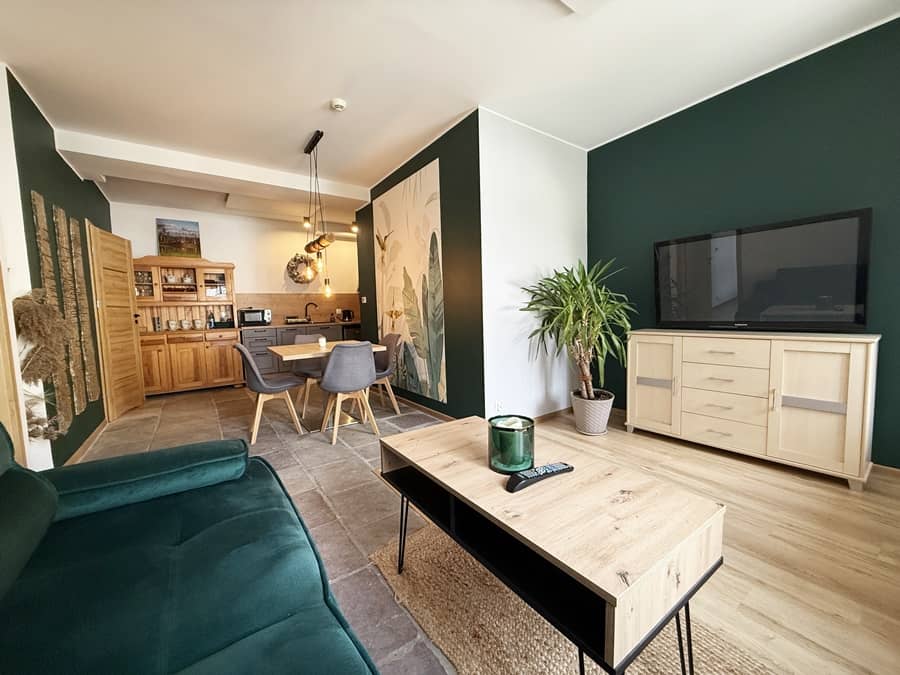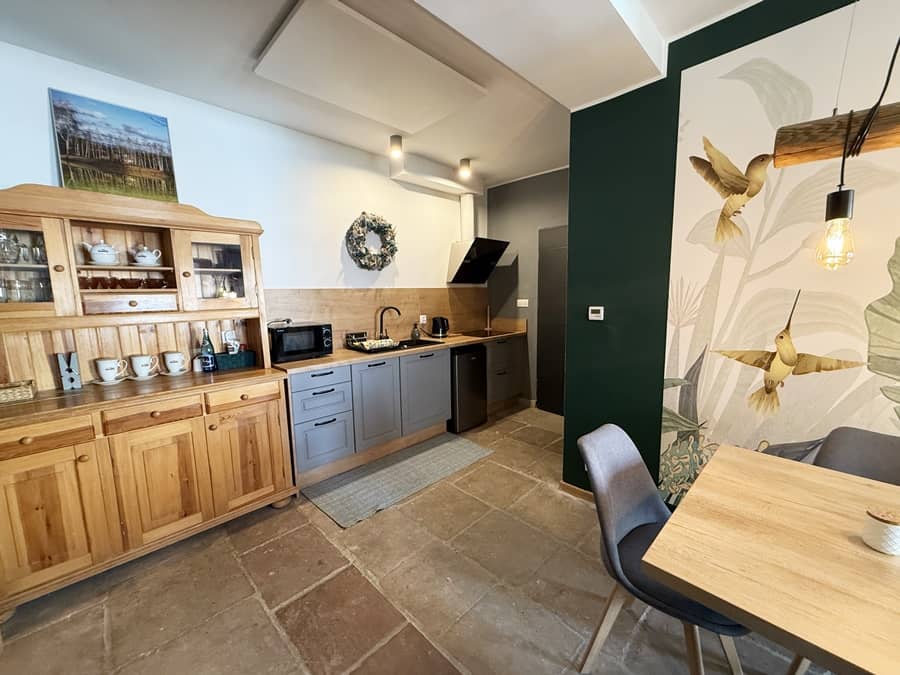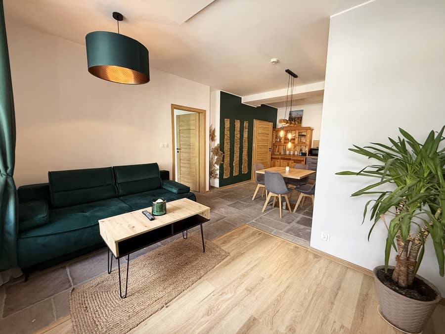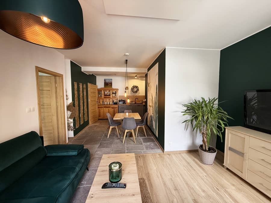 Mieszkanie w pełni wyposażone. Aneks kuchenny wyposażony w małą lodówkę, płytę elektryczną, zmywarkę, mikrofalówkę, okap. W łazience pralka. W sypialni znajduje się łóżko 2-osobowe oraz duża szafa w zabudowie. Strefa dzienna podzielona została na część jadalnianą ze stołem dla 4 osób oraz relaksacyjną z wygodną sofą, stolikiem kawowym, komodą oraz telewizorem.