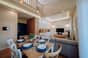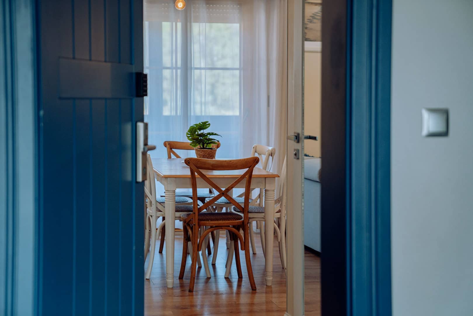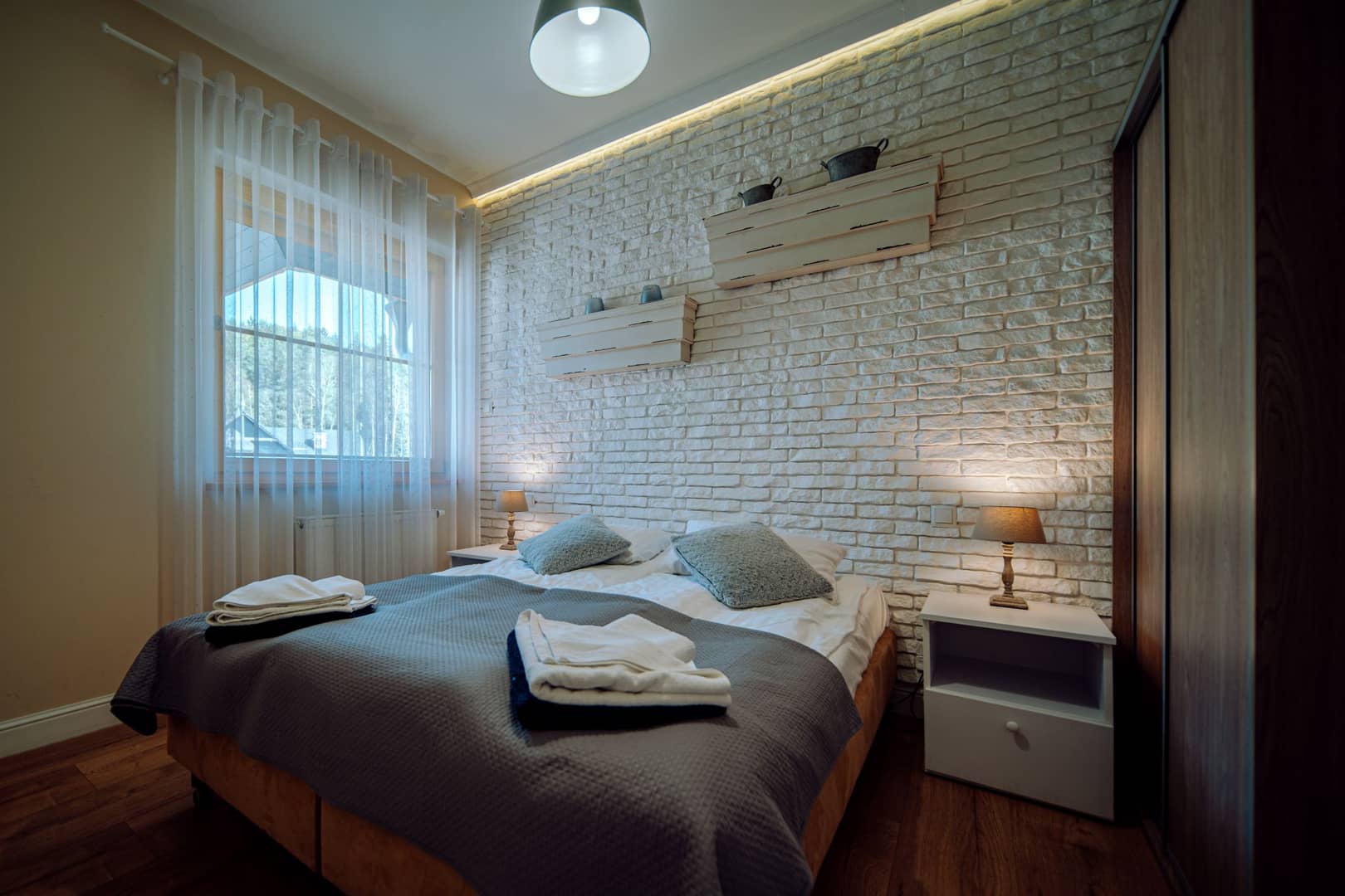 Wnętrze obejmuje: duży hol z zabudową garderobianą, oddzielną sypialnię z możliwością konfiguracji łóżek, salon z wygodną sofą rozkładaną i strefą telewizyjną, jadalnię dla sześciu osób oraz kompletnie wyposażony aneks kuchenny ze zmywarką i pralką. Do tego funkcjonalna łazienka z prysznicem.
