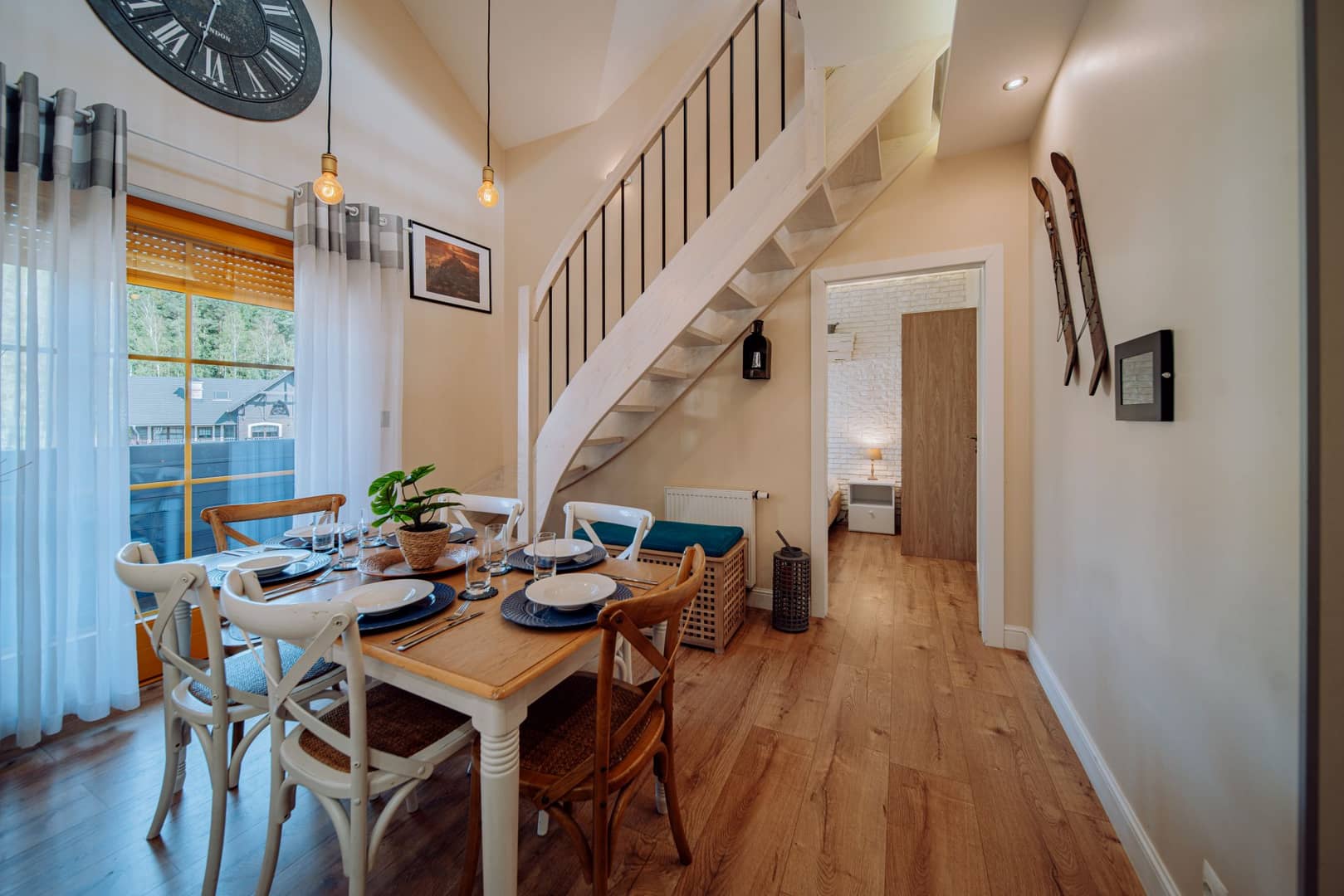 Apartament wyróżnia się dużymi przeszkleniami i dwoma balkonami: jeden z salonu wychodzi na starannie zagospodarowany ogród, drugi — z antresoli — pozwala podziwiać Szrenicę.