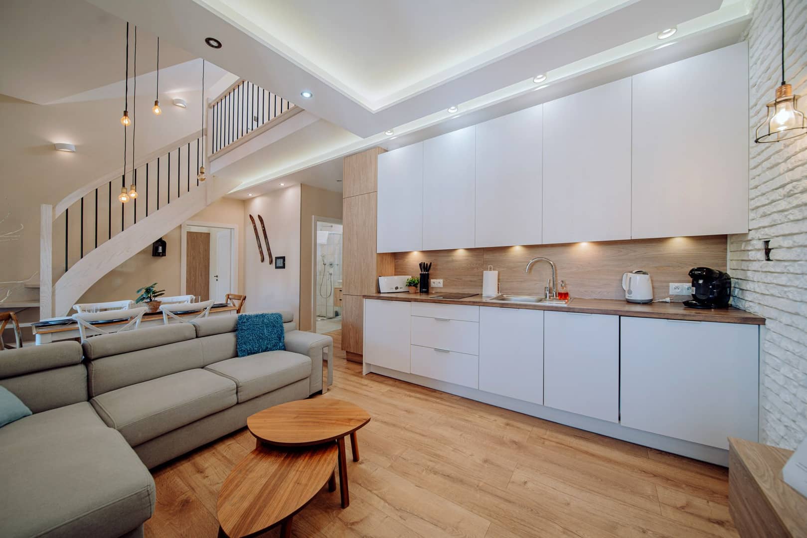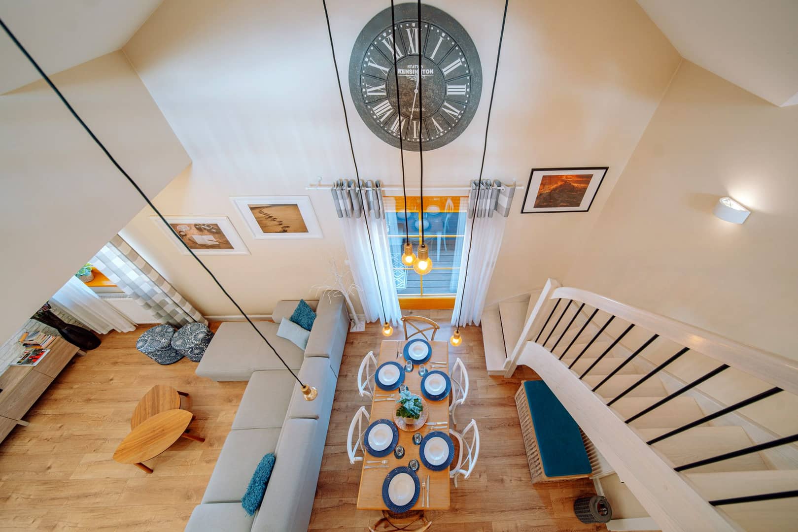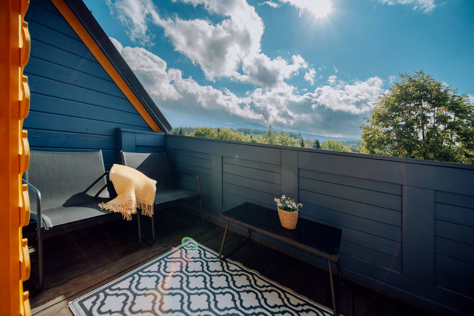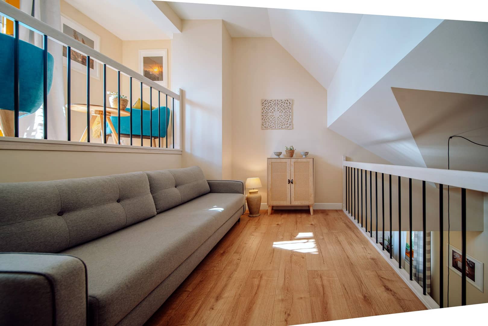 Na antresoli znajduje się kolejna przestrzeń sypialniana z dwuosobową sofą oraz przytulny kącik wypoczynkowy z widokiem na górskie panoramy.