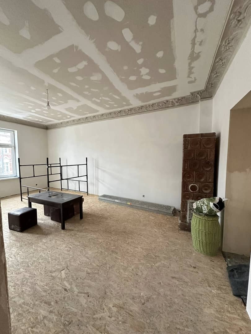 Stylowe piece kaflowe, zdobione sufity, nowa instalacja elektryczna.