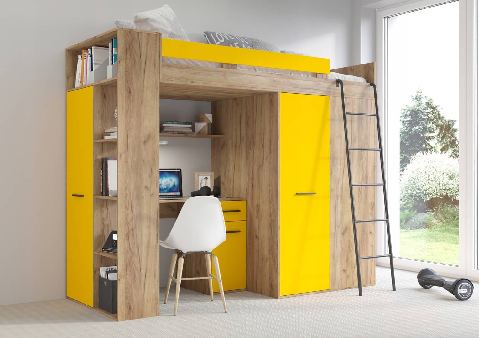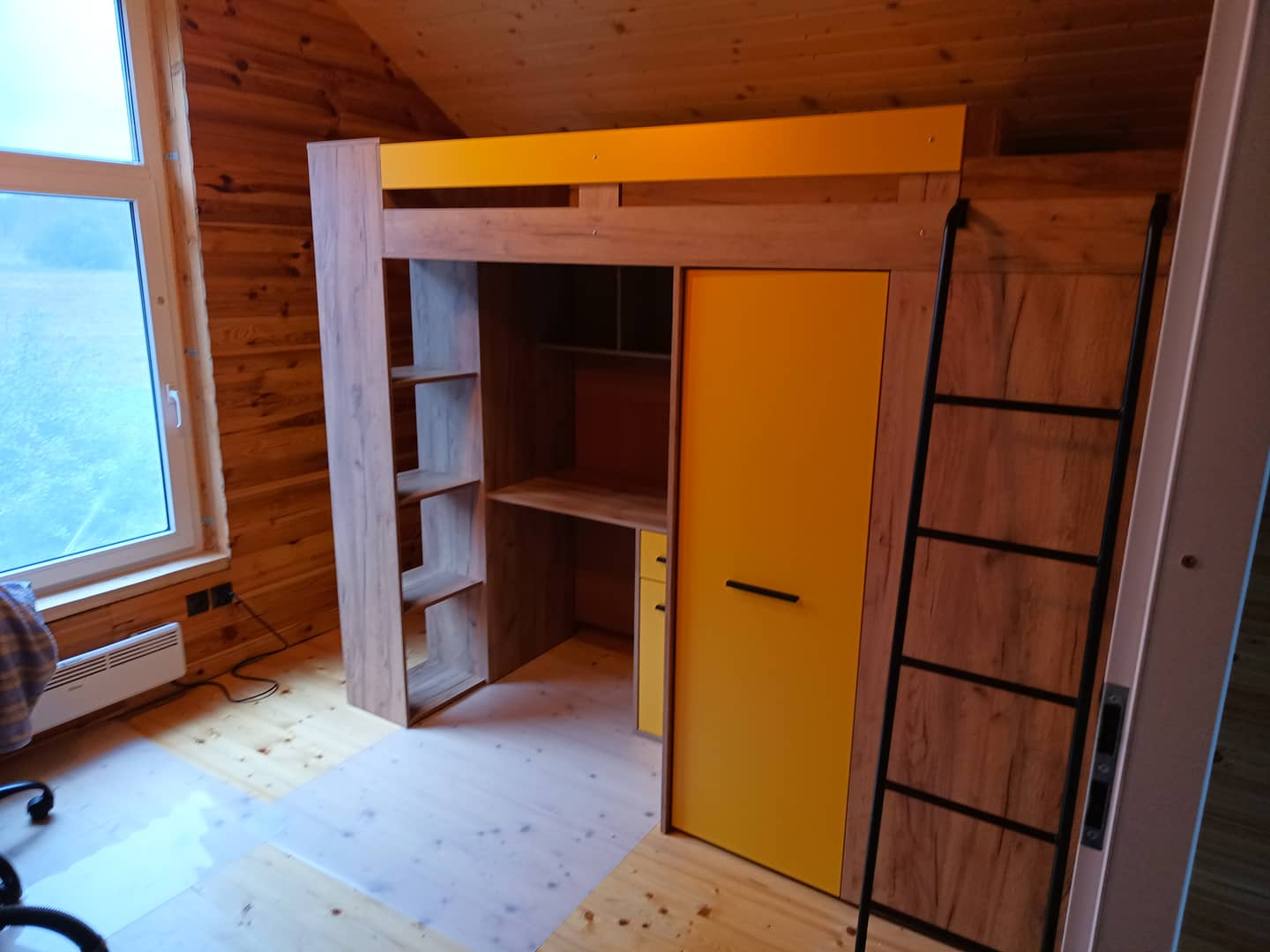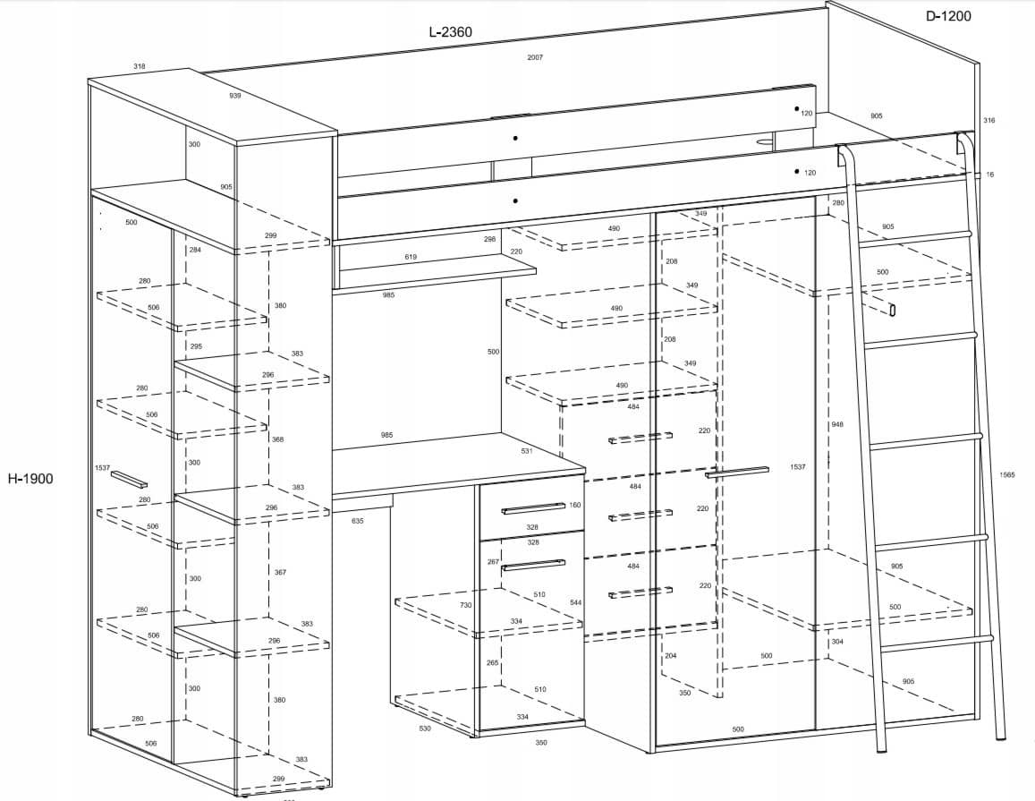 łóżko piętrowe z biurkiem, szafą, regałem -1000