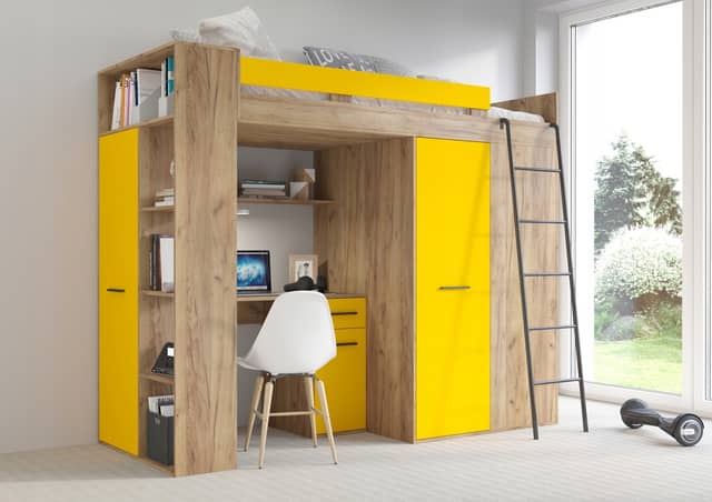 Praktyczny zestaw mebli do małego pokoju - łóżko piętrowe z biurkiem, szafą i regałem (Verana/Ravena) w kolorze dębu i żółtym. Idealne rozwiązanie do aranżacji przestrzeni w małym mieszkaniu lub pokoju dziecięcym. Rozmiary mebla: 120x190x236 cm. Stan techniczny - bardzo dobry, praktycznie brak śladów użytkowania, wygląda jak nówka. Mebelek rozkręcony, gotowy do ponownego montażu, ze względu na rozmiary nie wysyłam (ok 200 kg). Bardzo stabilna konstrukcja, syn był mega zadowolony. Odbiór osobisty lub mogę dowieźć do pewnej odległości - kwestia dogadania się. Cena nowego 3k, sprzedam za 1000.