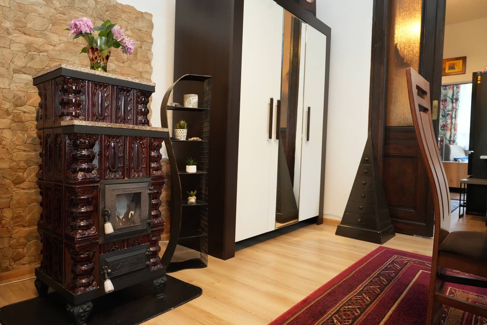 Ogrzewanie za pomocą pieca gazowego dwufunkcyjnego dodatkowo kominek kaflowy w salonie