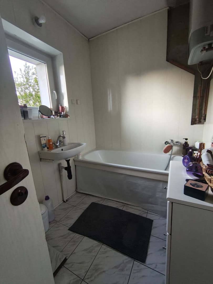 Stolarka okienna wykonana z PCV, a podłogi wykończone panelami, wykładziną PCV i kaflami.