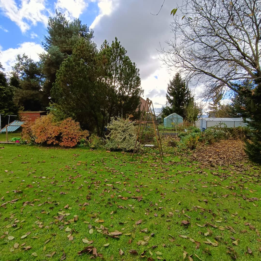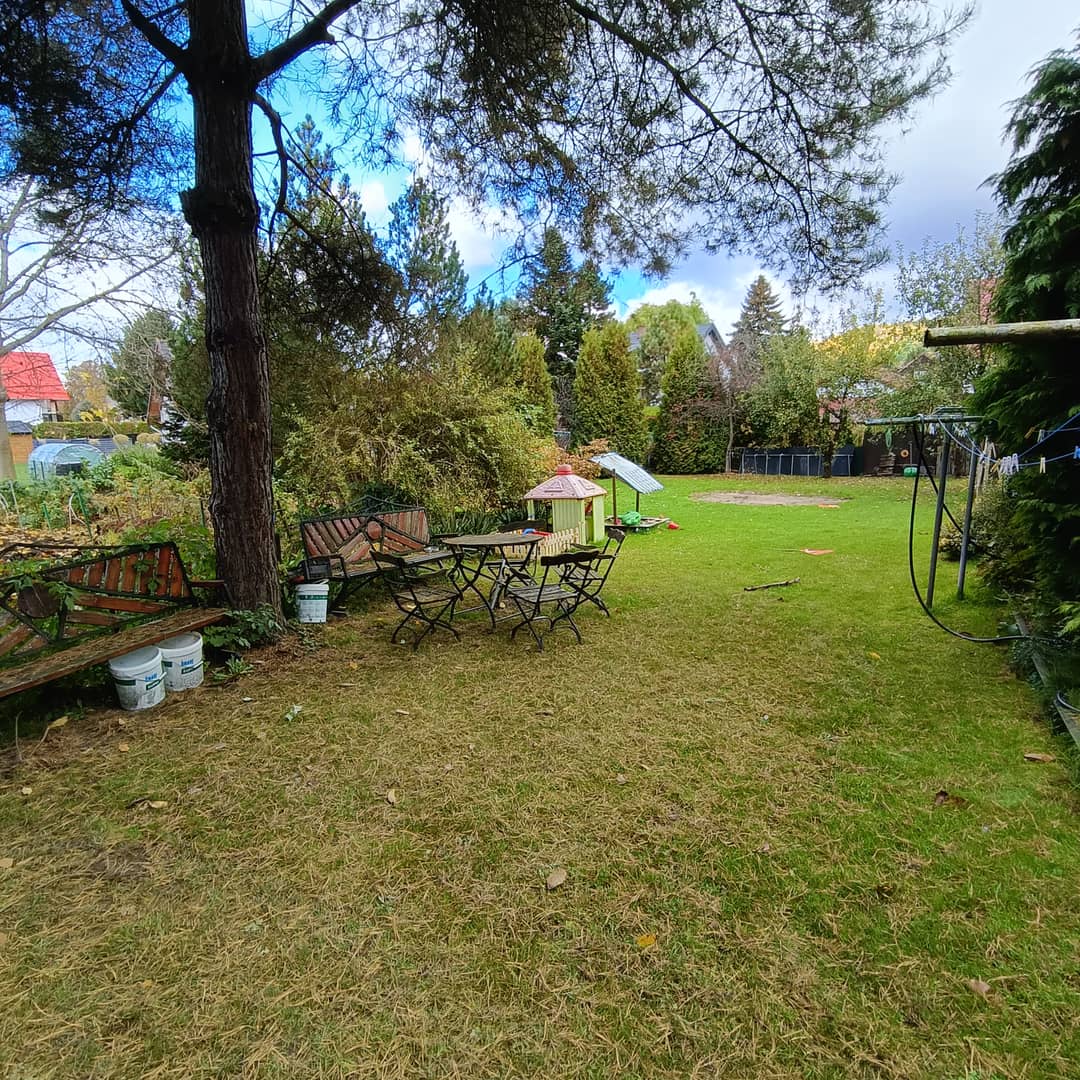 ogród z częścią zieloną, warzywniakiem i tunelem foliowym.