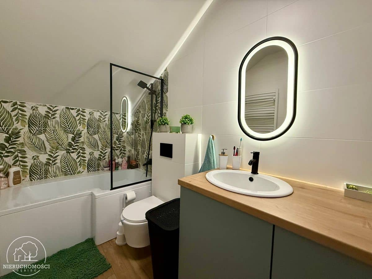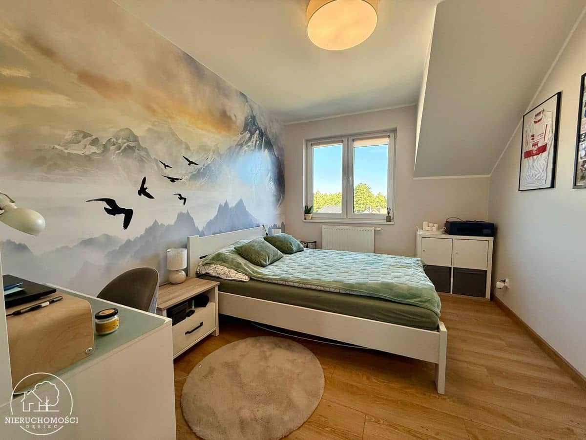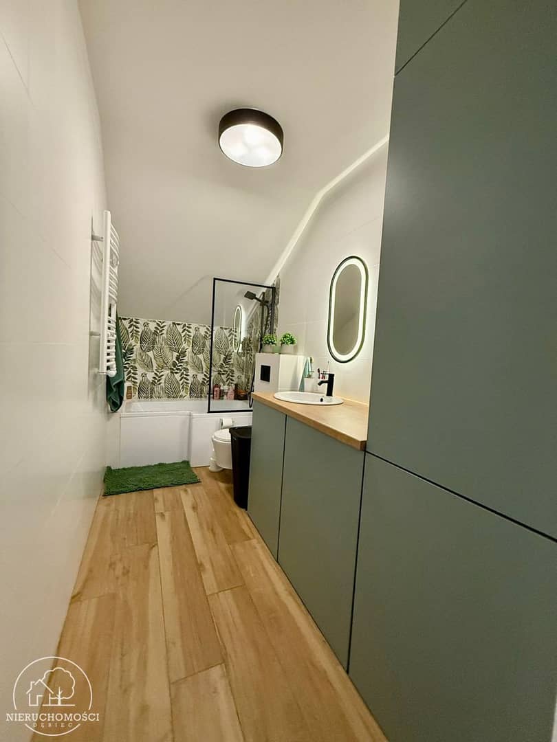 Na podłogach wysokiej jakości panele oraz kafle, stolarka okienna PCV. Ogrzewanie oraz ciepła woda z dwufunkcyjnego pieca gazowego.