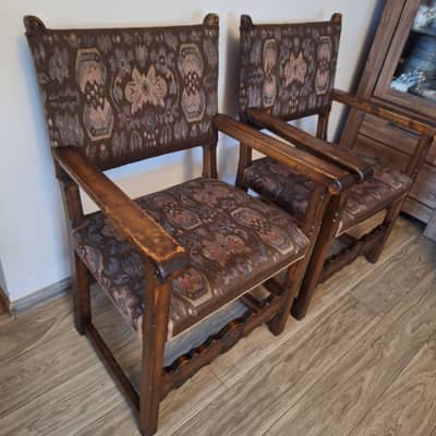 Dwa stylowe dębowe krzesła, rzeźbione, w dobrym stanie bez uszczerbień w drewnie, bez plam na tapicerce . Krzesła te są trwałe i wytrzymałe. Możliwy transport lub odbiór osobisty. Cena za sztukę 150 zł.