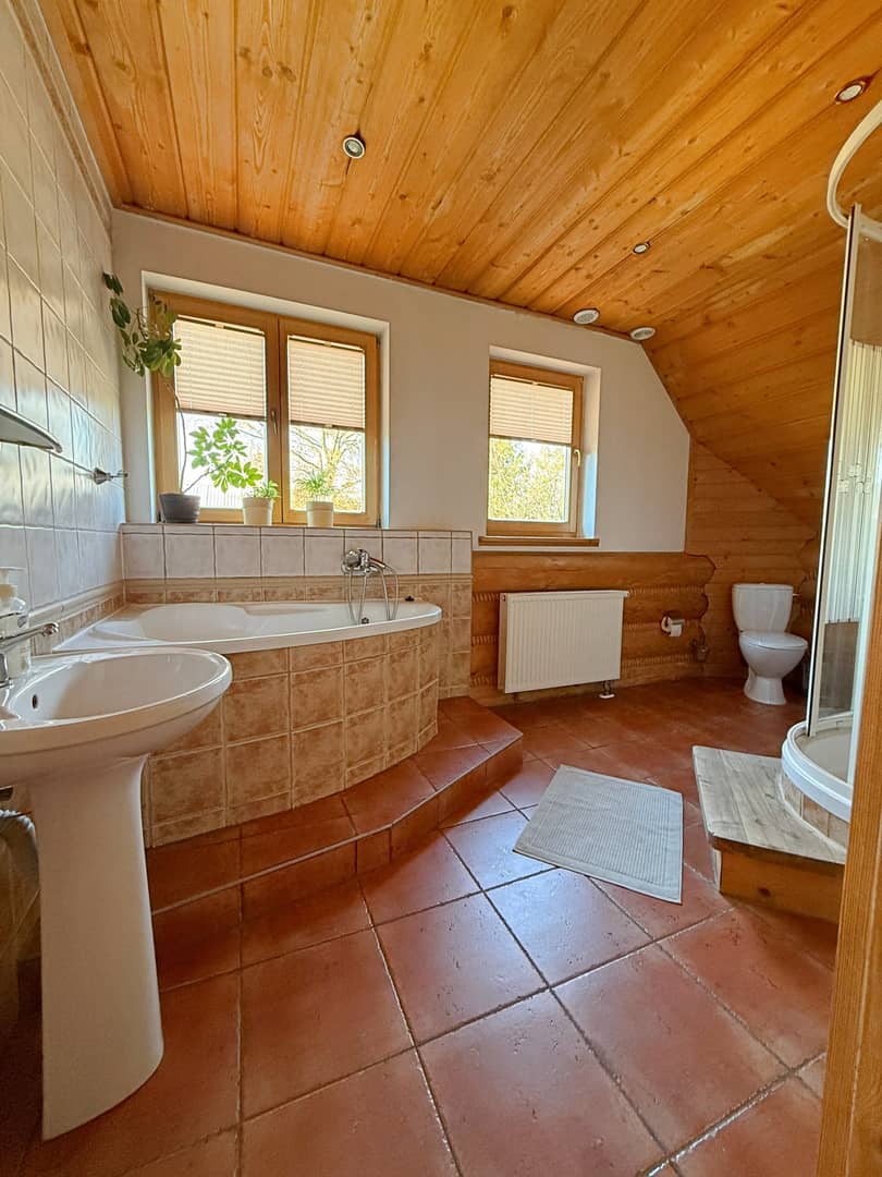 Piętro: dwie sypialnie i duża łazienka z toaletą.