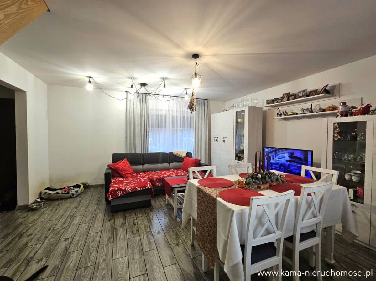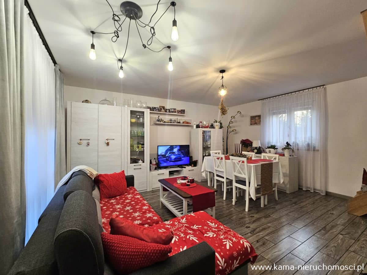 - jasny salon z jadalnią i wyjściem na ogród, idealny na relaks i spotkania