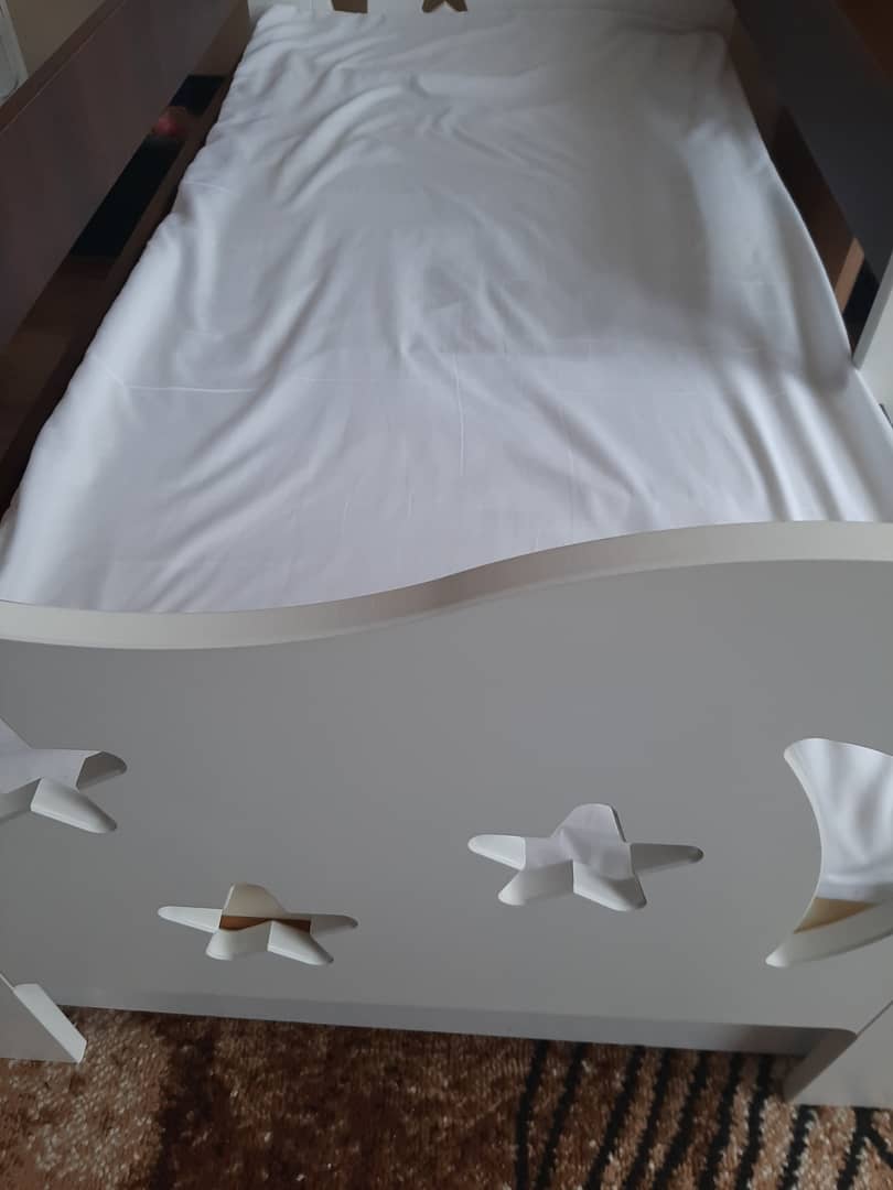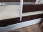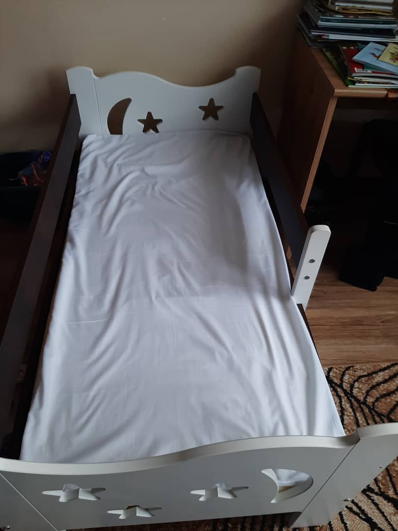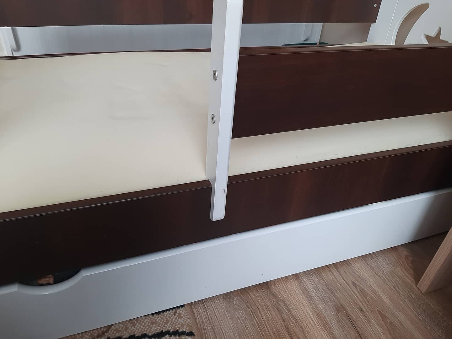 Łóżeczko, materac, stelaż, szuflada na pościel kolor brązowo - biały. Cena 350 zł.
