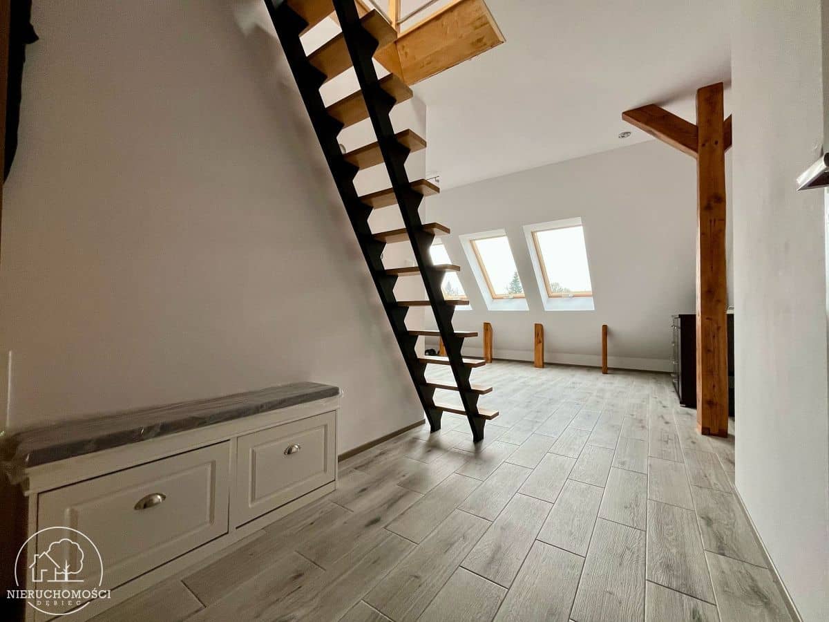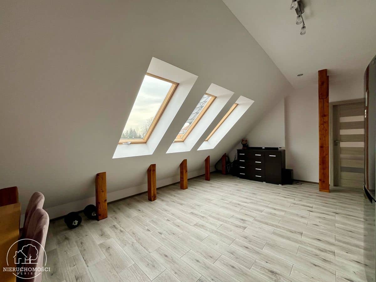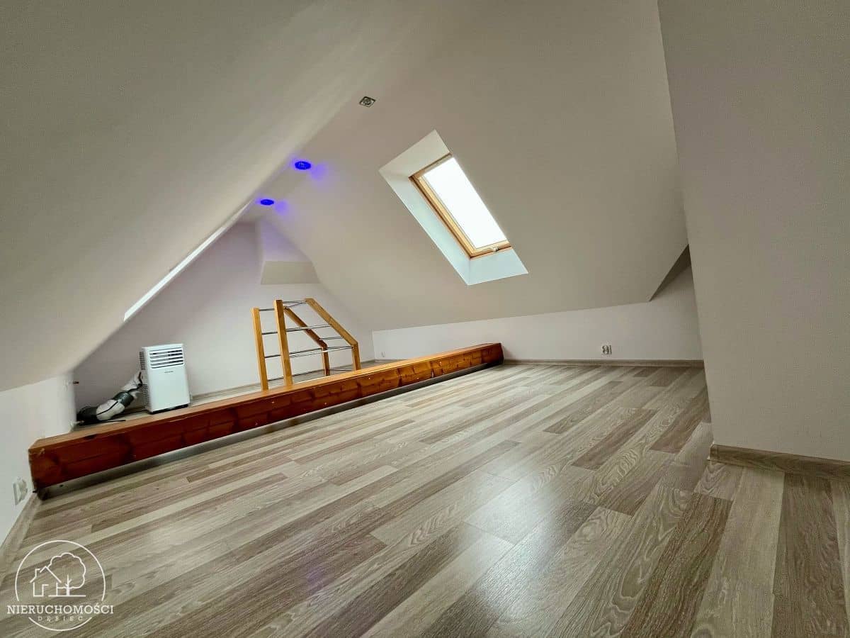 Na podłogach panele oraz kafle, stolarka okienna PCV (okno balkonowe) oraz drewniana (okna dachowe).