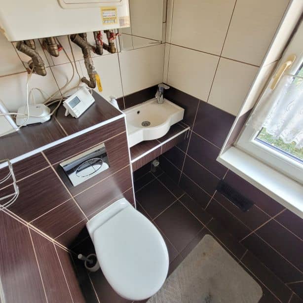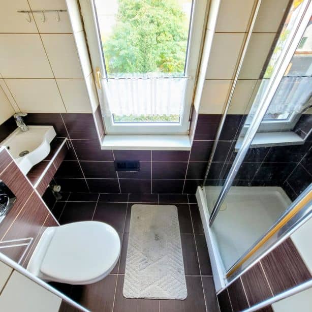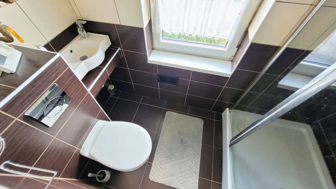 -łazienka z oknem, kabiną prysznicową i toaletą, wykafelkowana - istnieje możliwość jej powiększenia kosztem kuchni