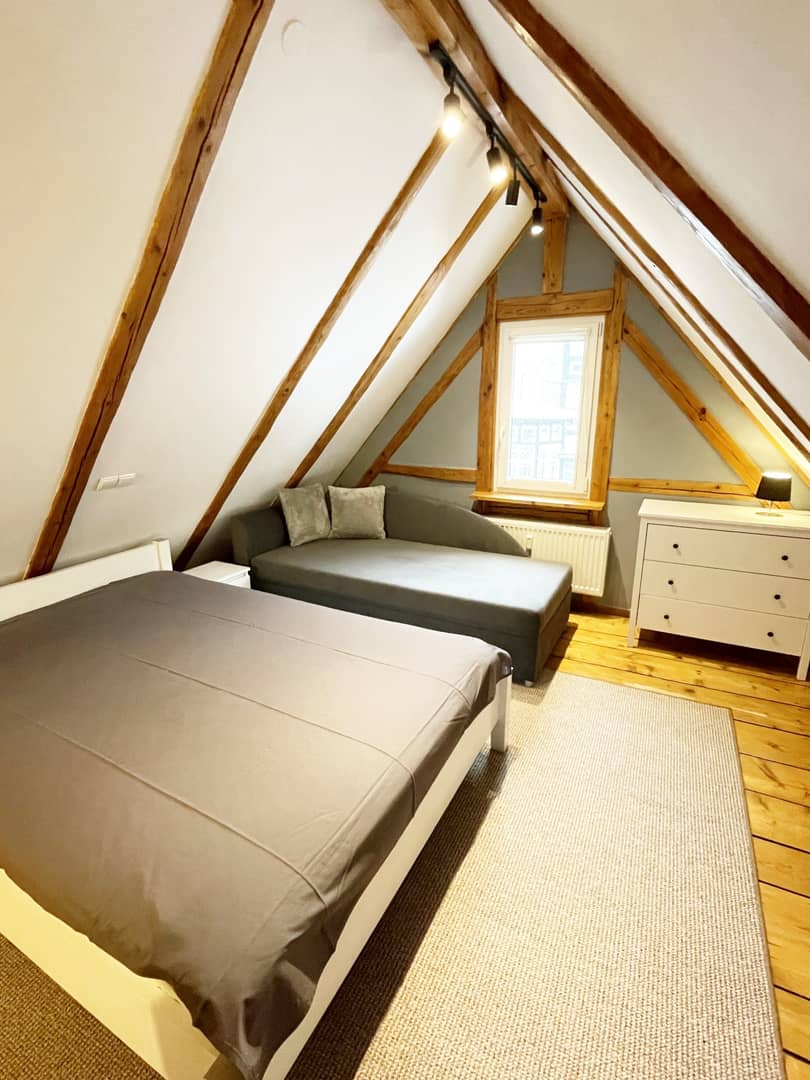 - duża, widna antresola z trzema miejscami sypialnianymi (1 łózko podwójne i 1 pojedyncze)
