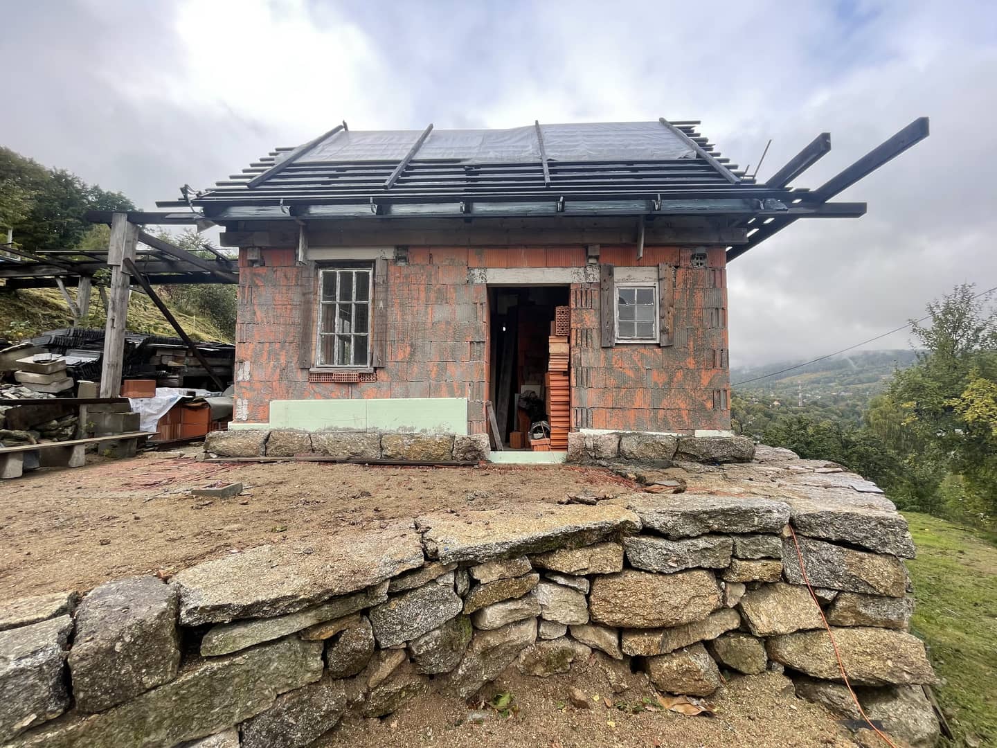 Ściany zewnętrzne 100 letniego domu (150m2) mają przygotowane mocowania do elewacji z desek, co pozwala na ich szybkie obicie. Ściany nie mają wilgoci, bo jest nowa kilkuletnia izolacja pozioma.
