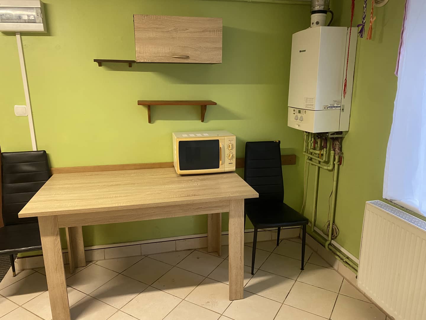 Sprzedawane z pełnym wyposażeniem: meble kuchenne, szafa, dwie wersalki, stół, krzesła.
