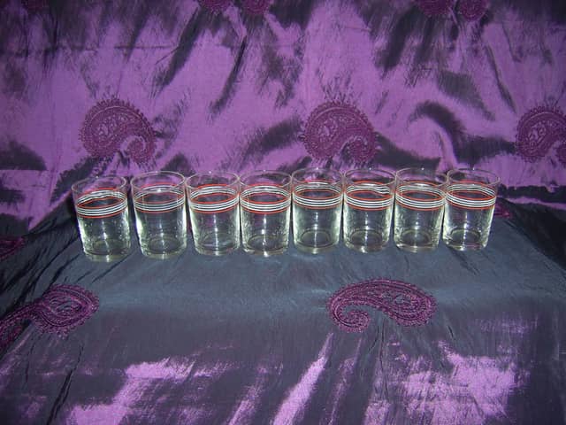 Sprzedam zestaw składający się z 8 małych literatek z czerwono-białymi paskami. Wysokość 7,5 cm. Średnica 5 cm. Pojemność 100 ml. Średnica podstawy 4,5 cm. Niewielkie oznaki przechowywania/użytkowania. Jedna literatka posiada w szkle bąbelek powietrza. 10 zł.