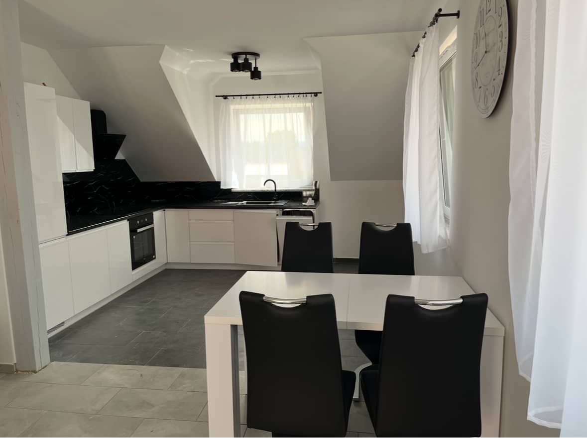 Salon z aneksem kuchennym (pełne wyposażenie: meble, piekarnik, lodówka, zmywarka, płyta indukcyjna, okap, stół, narożnik)