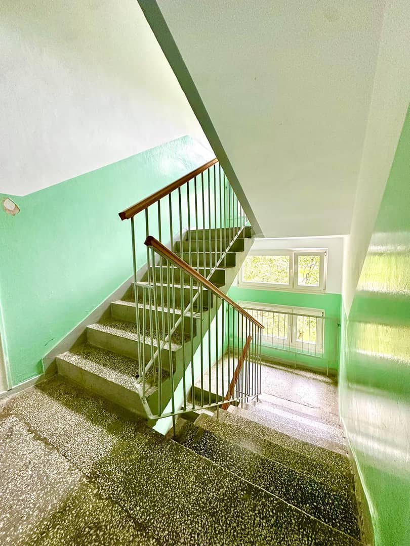 Budynek po termomodernizacji, zarządzany przez Spółdzielnię Mieszkaniową JSM – klatka schodowa po remoncie, budynek po termomodernizacji.