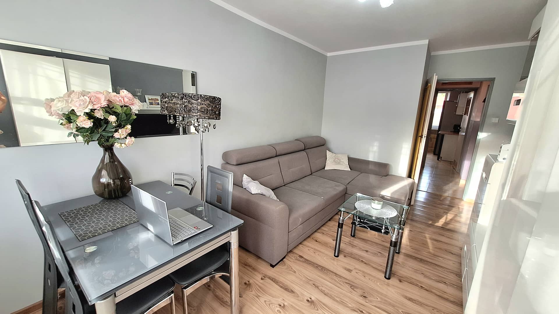 Mieszkanie jest dobrze utrzymane i do wprowadzenia. Na podłogach płytki i panele, okna plastikowe PCV.