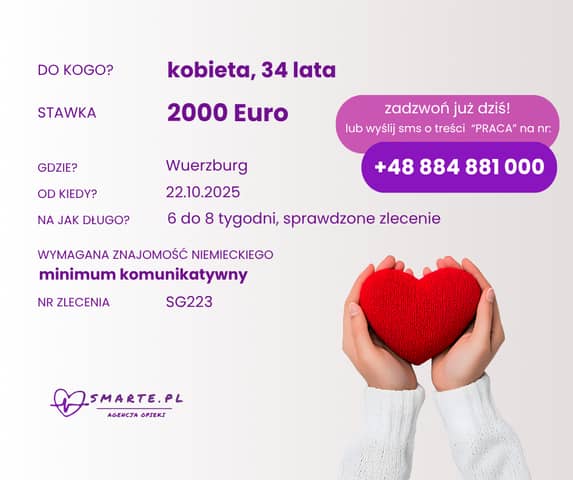 Podopieczna cierpi na zespół chronicznego zmęczenia.* Przesypia noce i znaczną część dnia. Do zadań Opiekunki będzie należało przygotowywanie posiłków oraz pomoc przy higienie osobistej