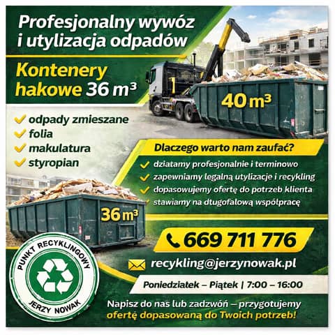 Oferujemy kompleksową obsługę w zakresie wywozu oraz zagospodarowania odpadów przy użyciu kontenerów hakowych o pojemności 36 m³ oraz 40 m³ przeznaczoną dla firm, inwestycji budowlanych oraz obiektów przemysłowych.