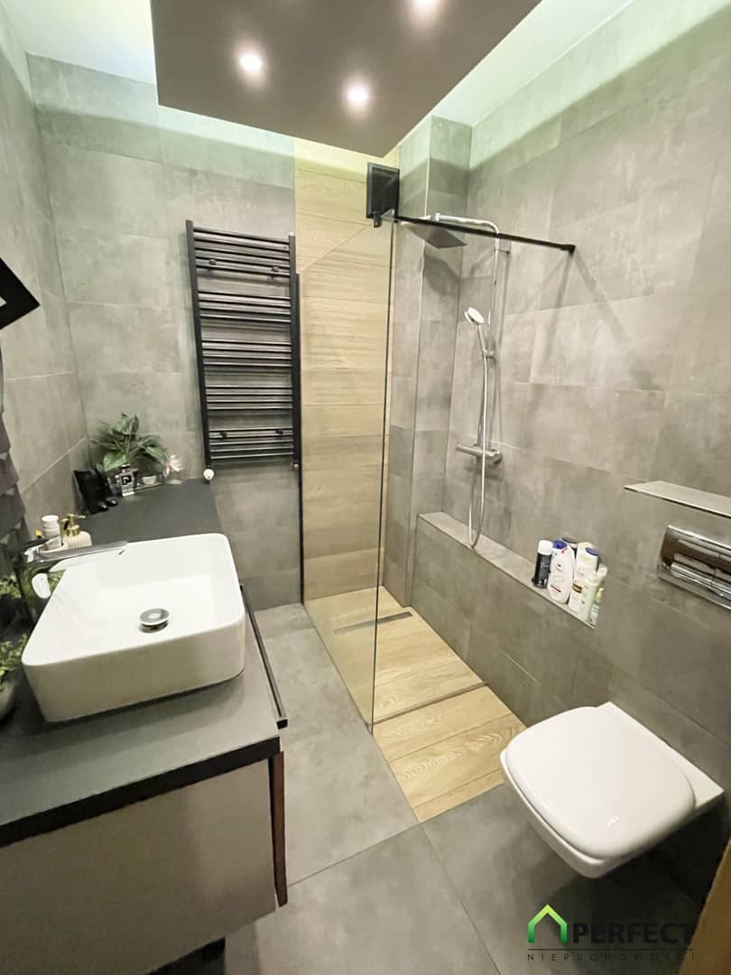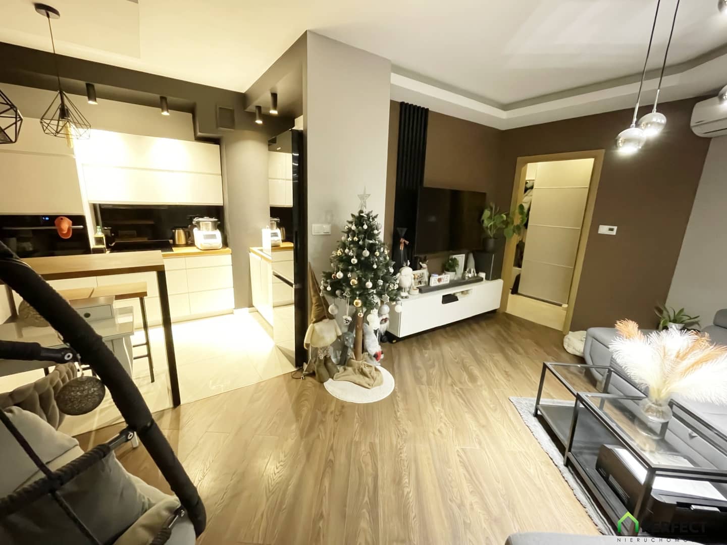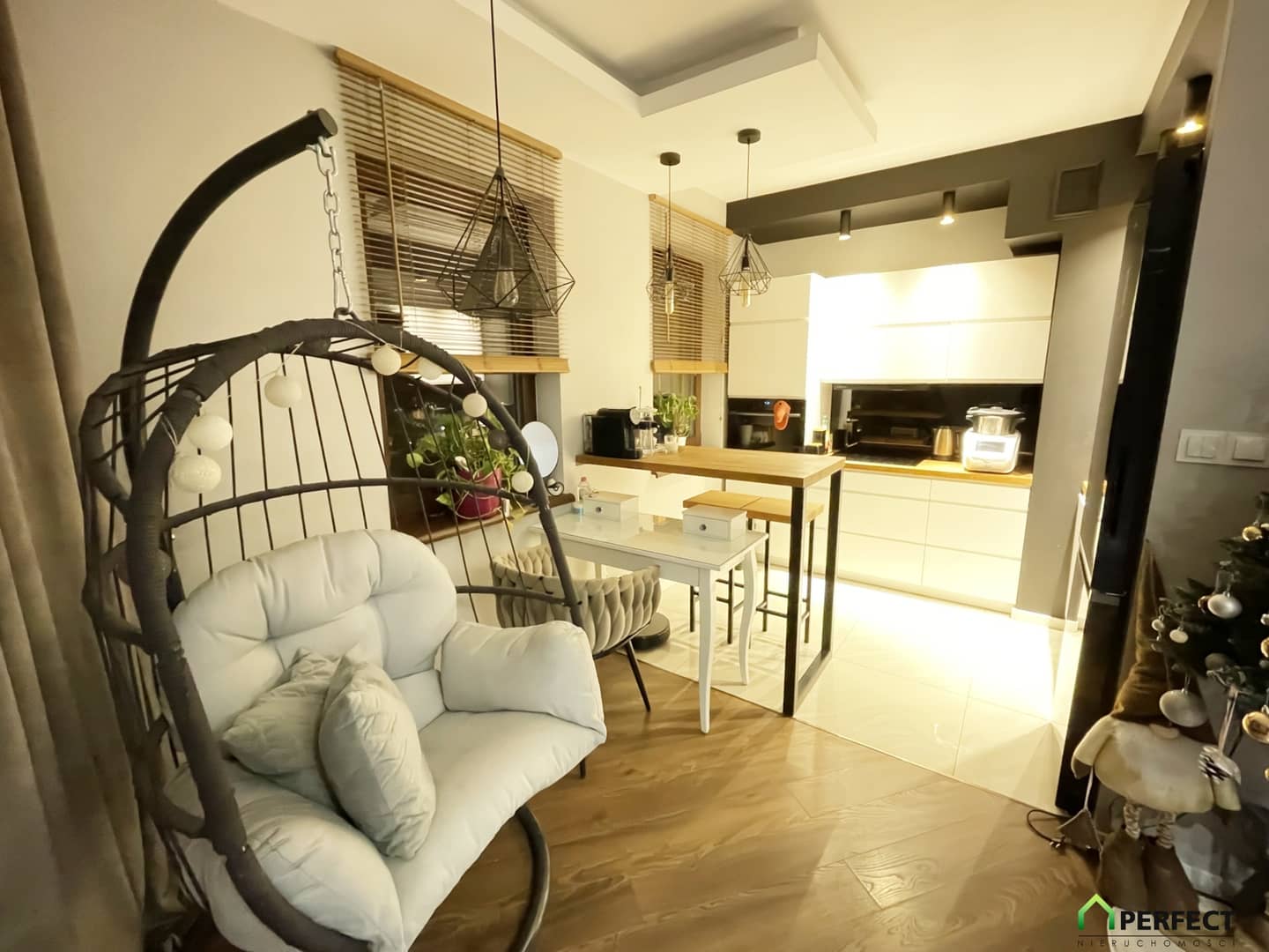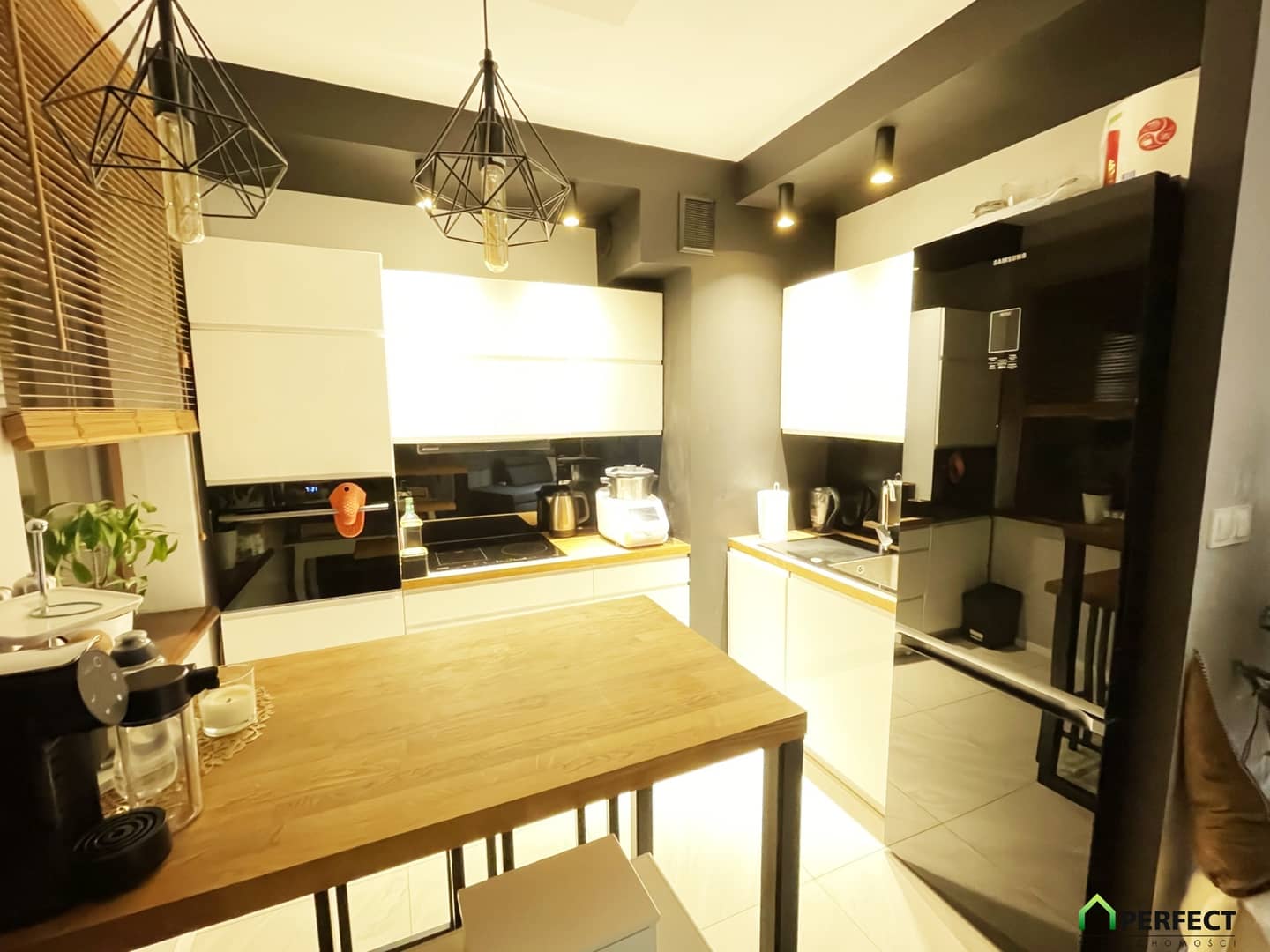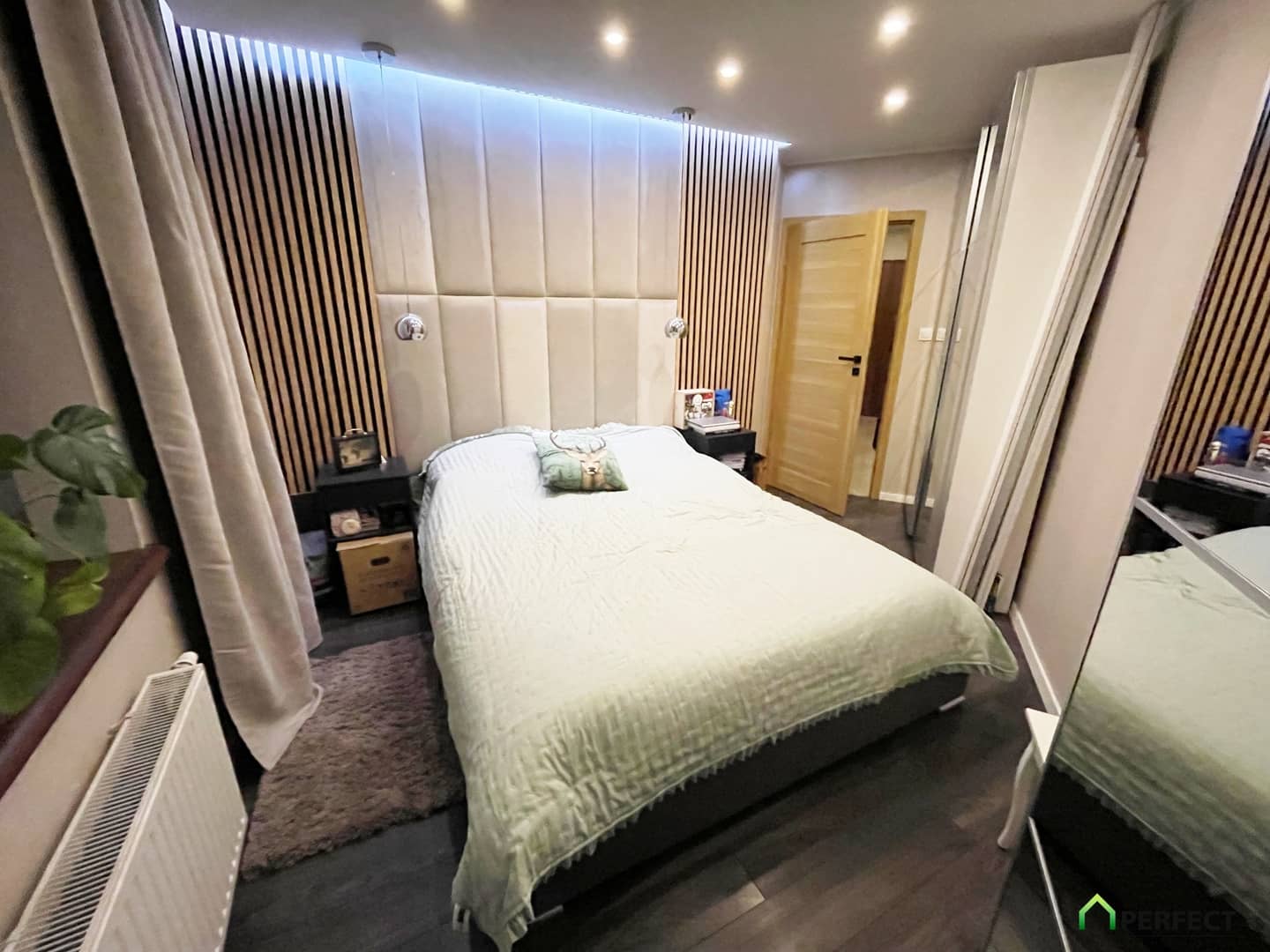 Mieszkanie urządzone zostało w sposób nowoczesny i bardzo funkcjonalny. W salonie, sypialni i kuchni podwieszono sufity oraz założono dodatkowe, klimatyczne oświetlenie ledowe. Na ścianach przyklejono ozdobne lamele oraz panele tapicerowane (w sypialni), co nadało wnętrzu dodatkowej przytulności.