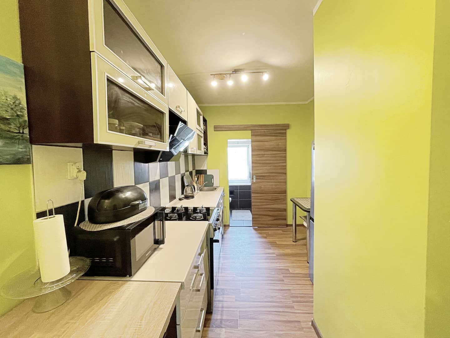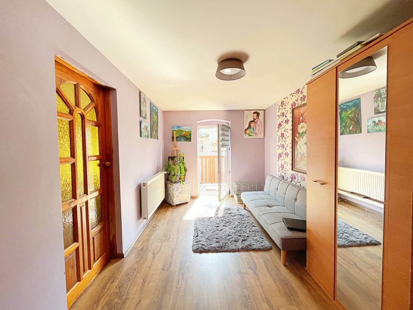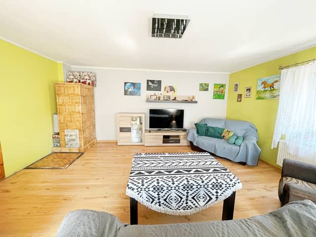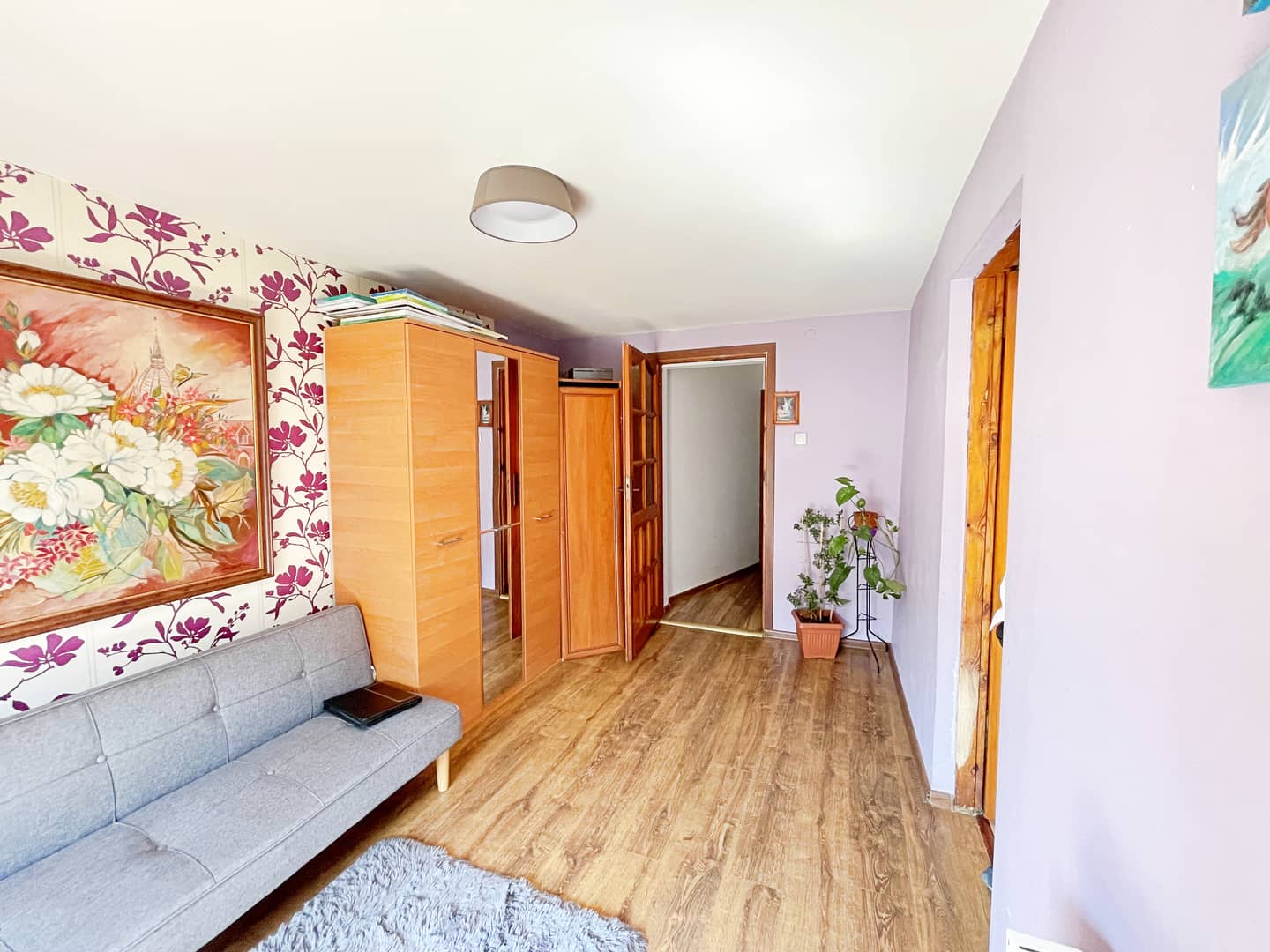 Mieszkanie słoneczne, trójstronna ekspozycja, wymaga gruntownego odświeżenia (drobnego remontu), okna plastikowe, na podłogach panele oraz kafelki. Przestronny salon z dwustronną ekspozycją dostarcza dużo naturalnego światła, z kolejnego pokoju wyjście na balkon na stronę południową, sypialnia z zachodnią ekspozycją. W pokojach znajdują się piece kaflowe, natomiast ogrzewanie mieszkania za pomocą kotła gazowego- dwufunkcyjnego.
