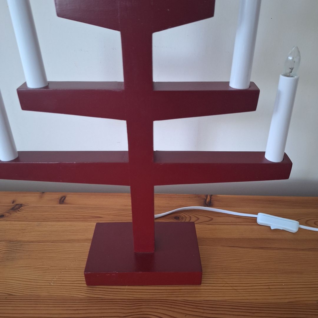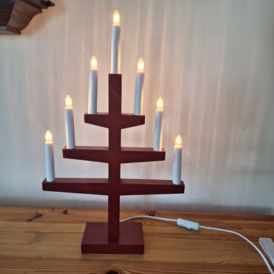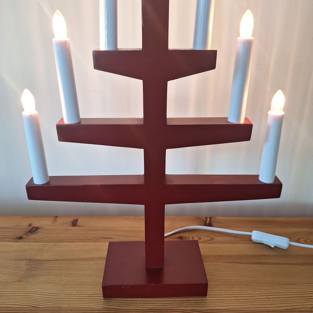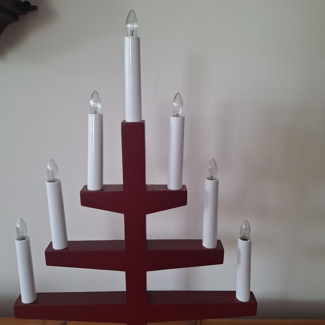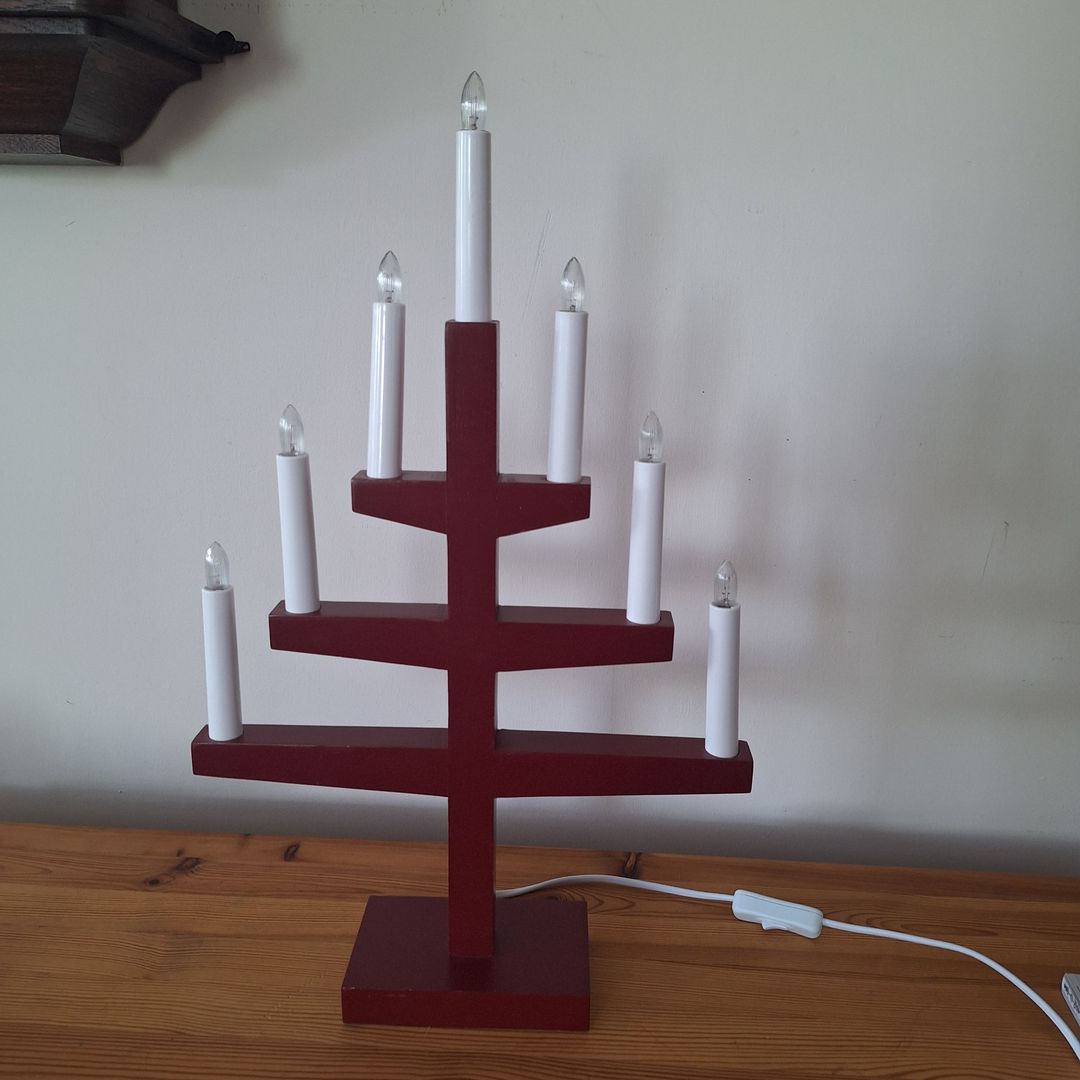 Świecznik mosiężny trzyramienny, mieszczą się podgrzewacze. Bogaty wzór skrzydeł, sygnatura i naklejka jest logiem zakładu rzemieślniczego w którym został zrobiony w Szwecji. Możliwy dowó