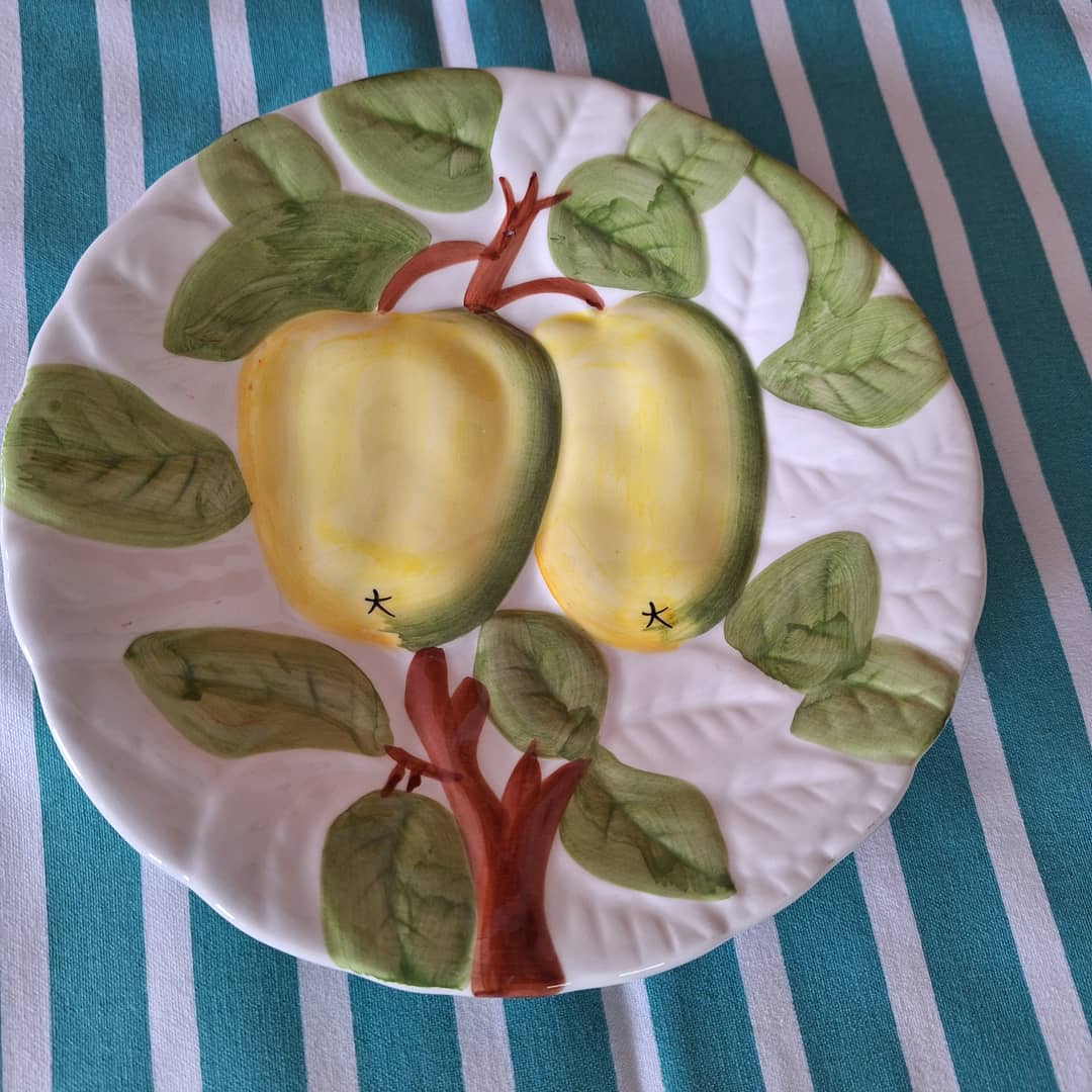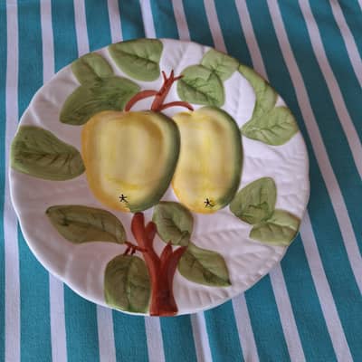 Talerz ozdobny w stylu Majoliki ,w soczystych kolorach ,ręcznie malowany ,wypukłe wzory,średnica 21 cm. Możliwy dowóz lub wysyłka. Cena 25 zł.