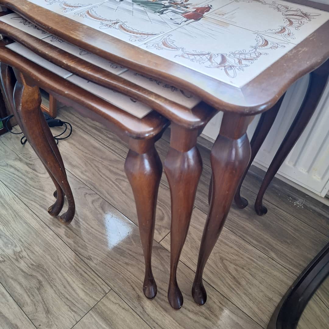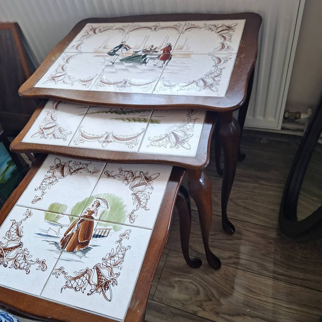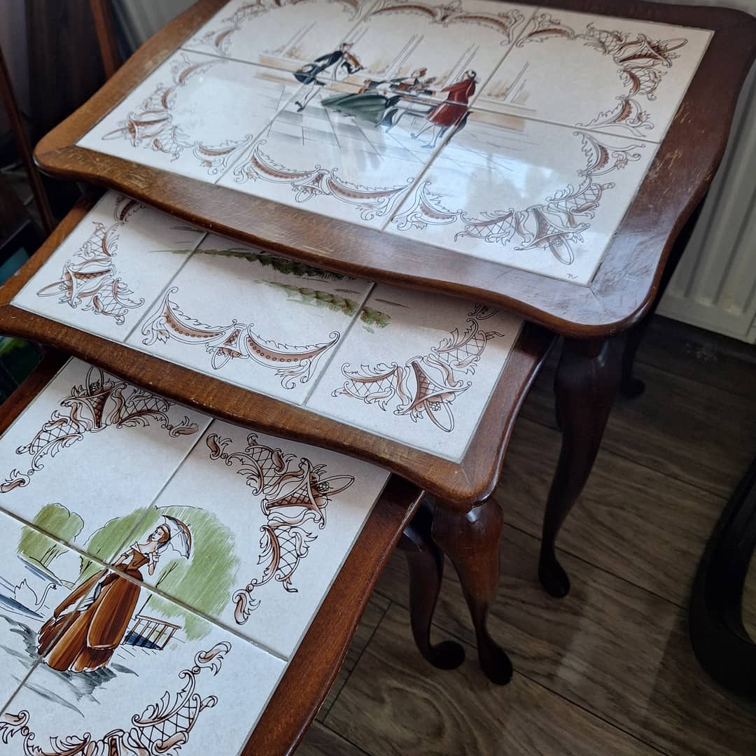 Trzy stoliki kawowe wsuwane jeden w drugi, blaty z płytkami na której jest scenka dworska, piękne nóżki. Wymiary największego 54/39/55 wysokość, średni 43/36/52 i trzeci 33/33/39 cm wysokość. Możliwy dowóz wysyłka. Cena 350 zł.