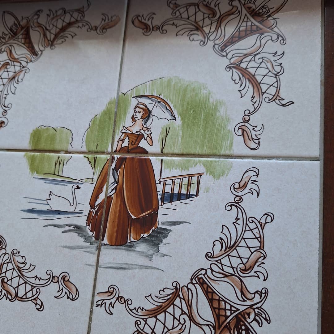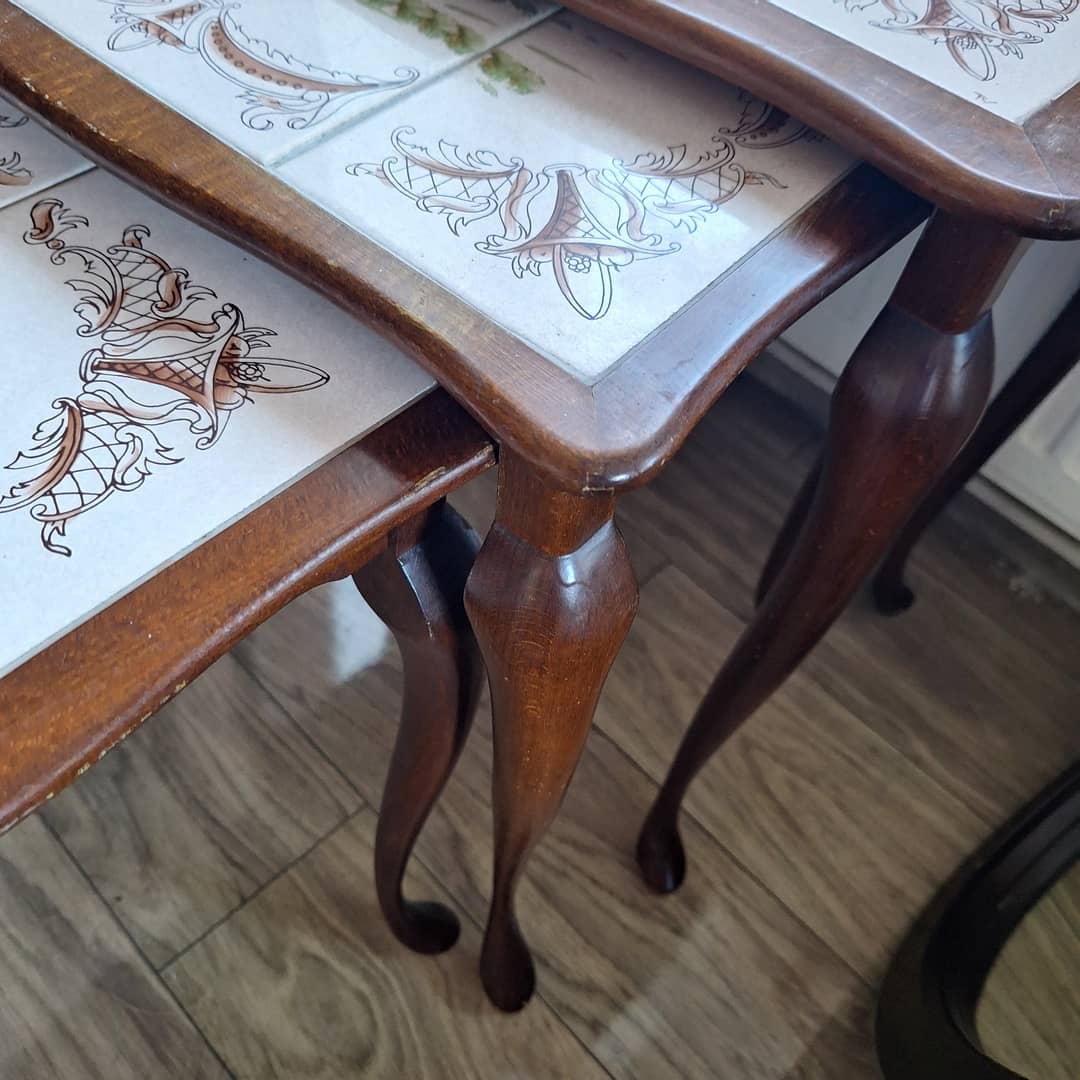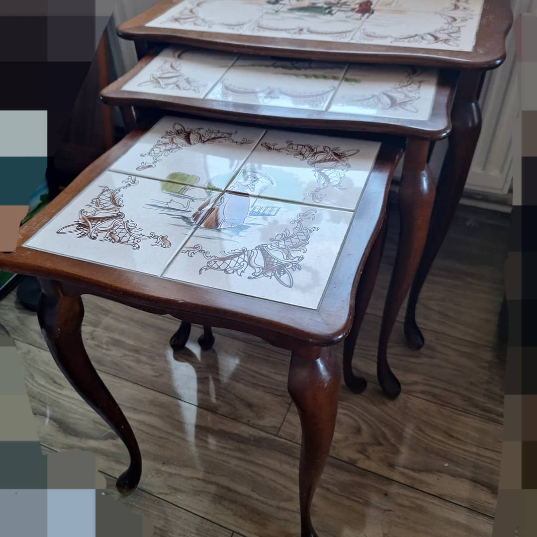 Trzy stoliki kawowe wsuwane jeden w drugi, blaty z płytkami na której jest scenka dworska, piękne nóżki. Wymiary największego 54/39/55 wysokość, średni 43/36/52 i trzeci 33/33/39 cm wysokość. Możliwy dowóz wysyłka. Cena 350 zł.