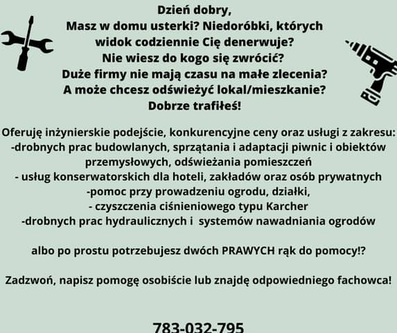 - usługi budowlane (skuwanie tynków, adaptacje piwnic i garaży, odświeżanie lokali, domów i mieszkań pod sprzedaż, współpracuję również z małymi hotelami nie posiadającymi własnej ekipy technicznej).
