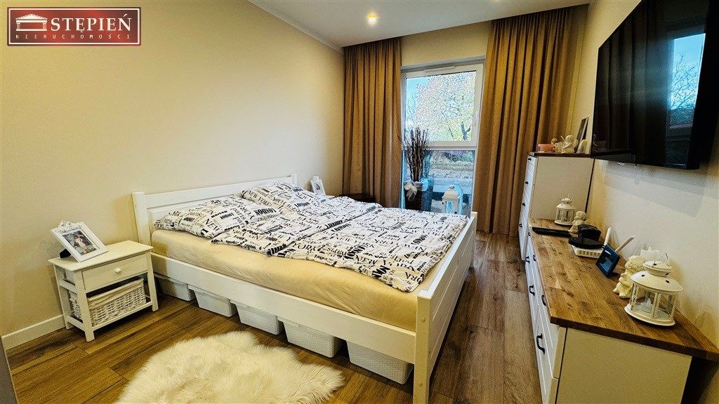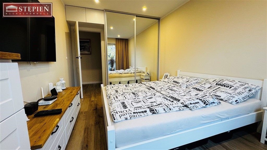 Komfortowa sypialnia z dużym łóżkiem małżeńskim, szafą w zabudowie