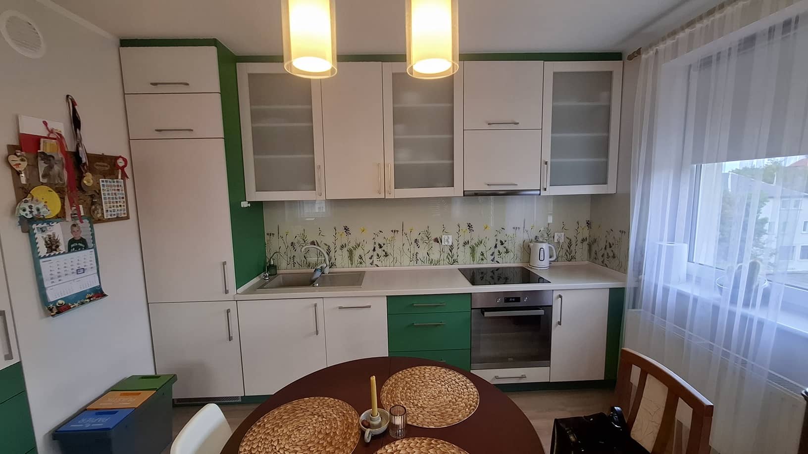 Wynajmowane jest mieszkanie z wyposażeniem widocznym na zdjęciu. Aneks kuchenny zaopatrzony jest w płytę grzewczą, zmywarkę, piekarnik i lodówkę.